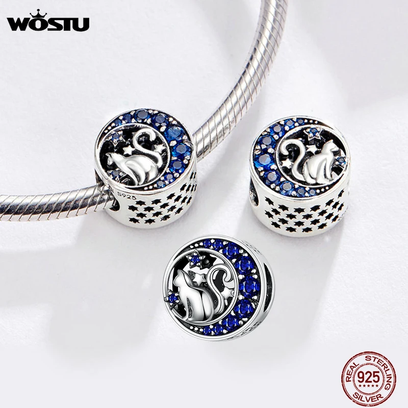 WOSTU Moon Star милые бусины кошка из стерлингового серебра 925 пробы, с голубой эмалированной подвеской, подходит к оригинальному браслету сделай сам, для изготовления ювелирных изделий CQC1204