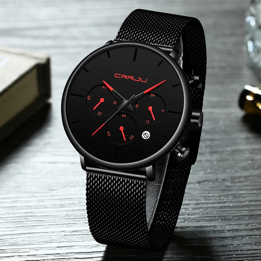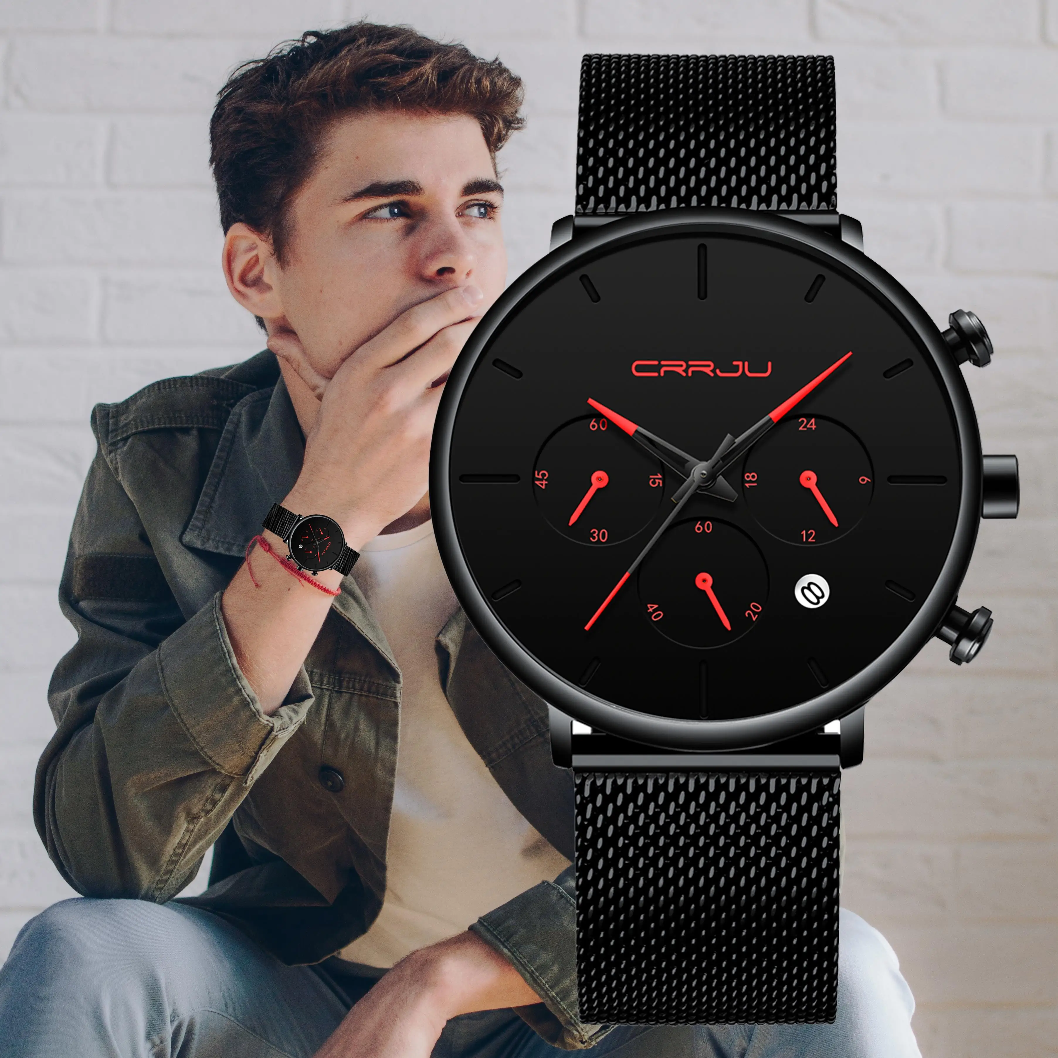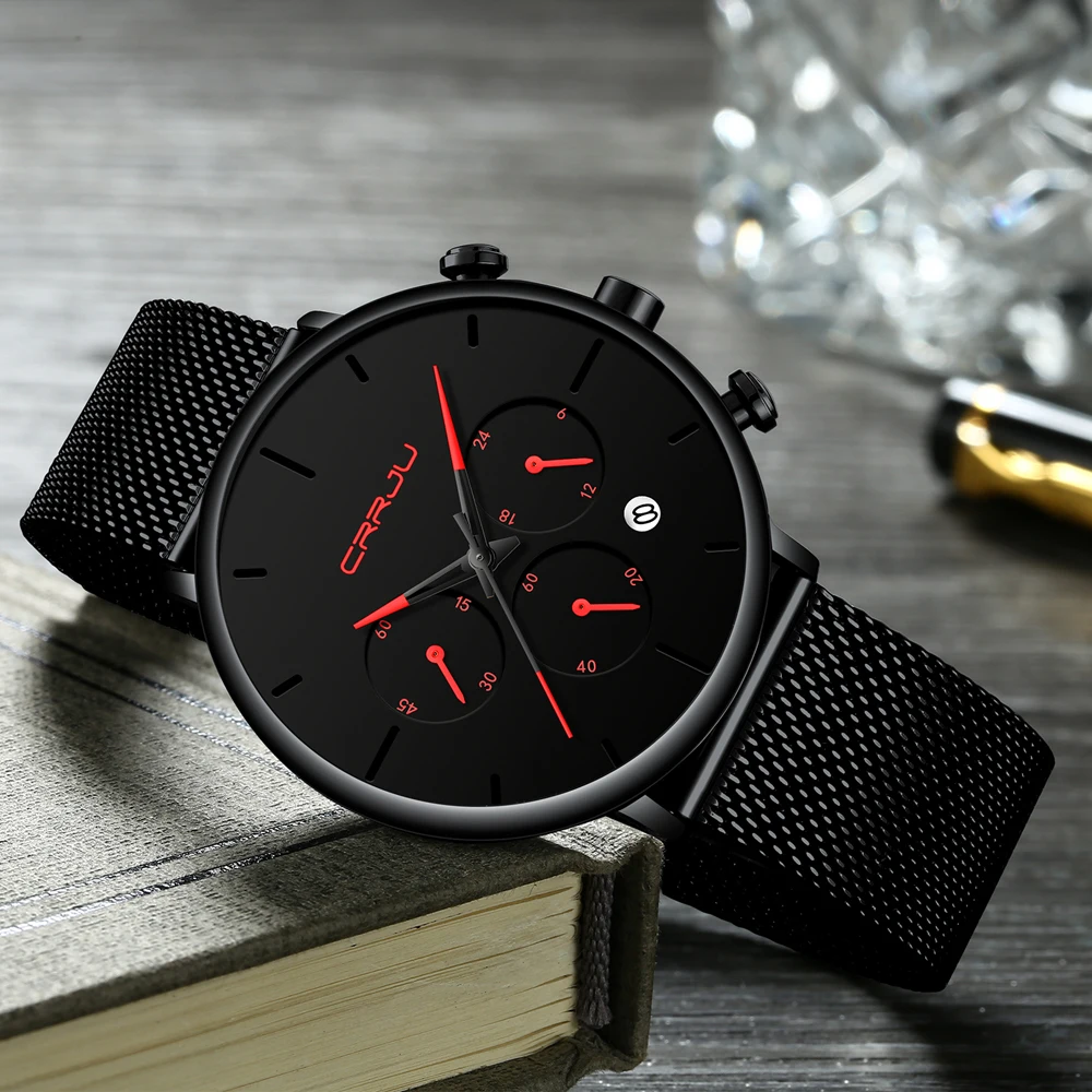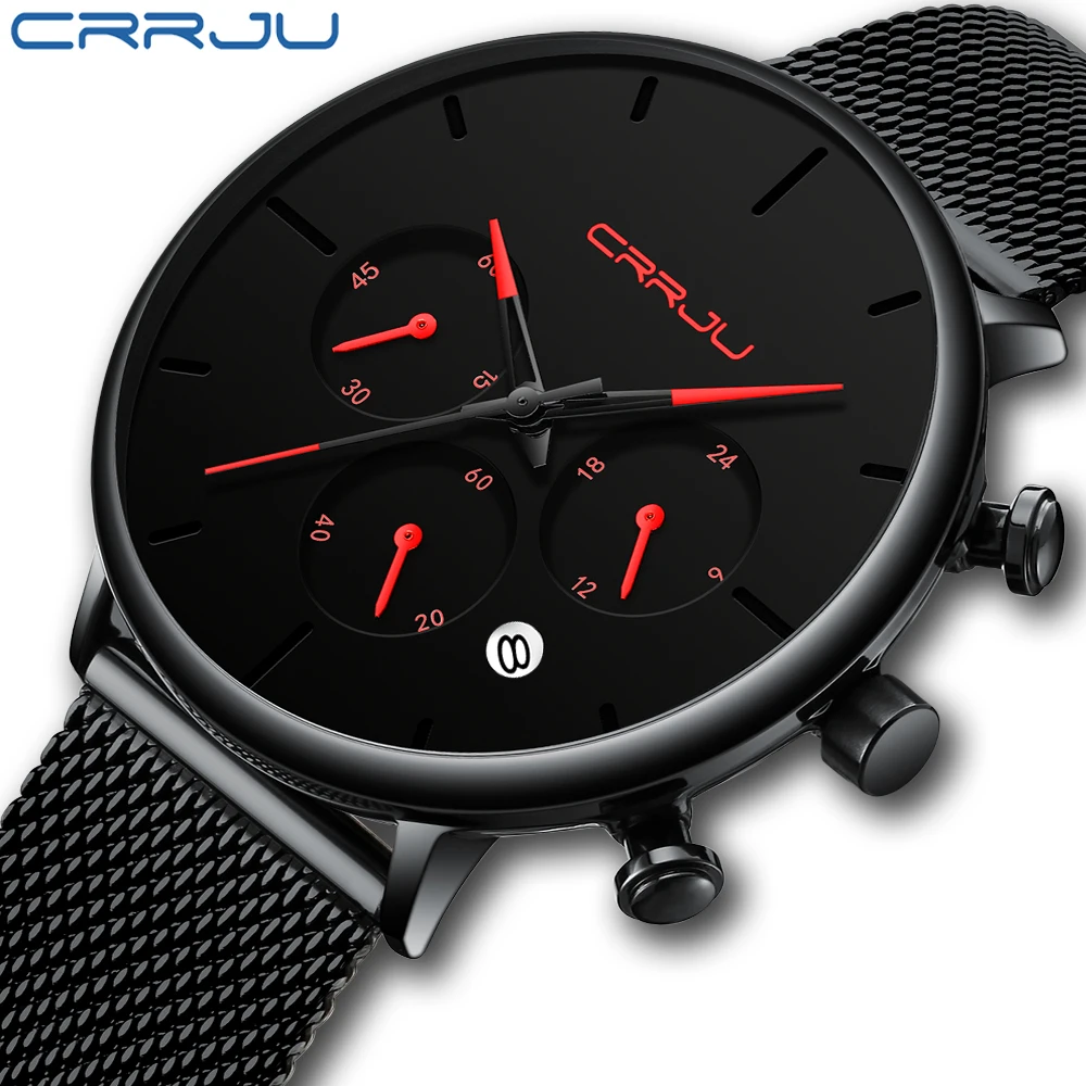 Часы наручные CRRJU мужские, деловые повседневные водонепроницаемые кварцевые с 3 суб циферблатом и тонким сетчатым ремешком