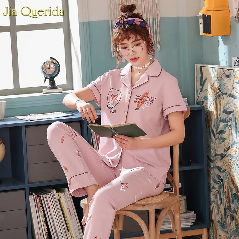 Спальный костюм женский пижамный комплект из 100% хлопка, модная Домашняя одежда розового цвета одежда для сна длинные штаны с короткими рукавами пижама для девочек-студенток
