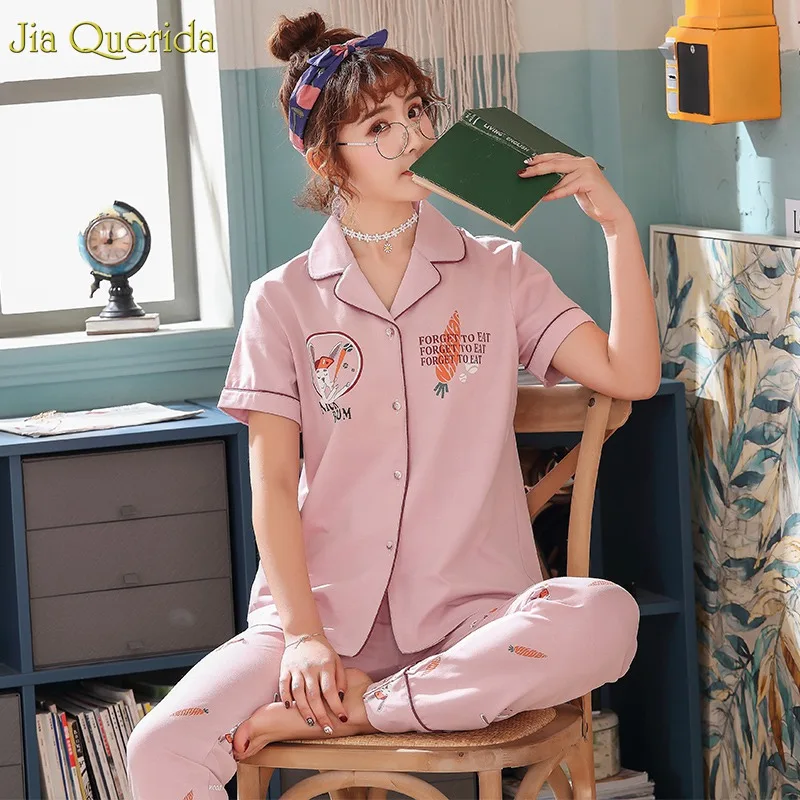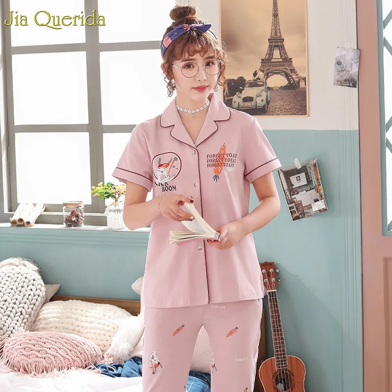 J & Q, хлопковые пижамы для женщин, лето 2019, новая модная Домашняя одежда с цветочным принтом, пижамный комплект, 100%, хлопковая Домашняя одежда, пижамный комплект для женщин