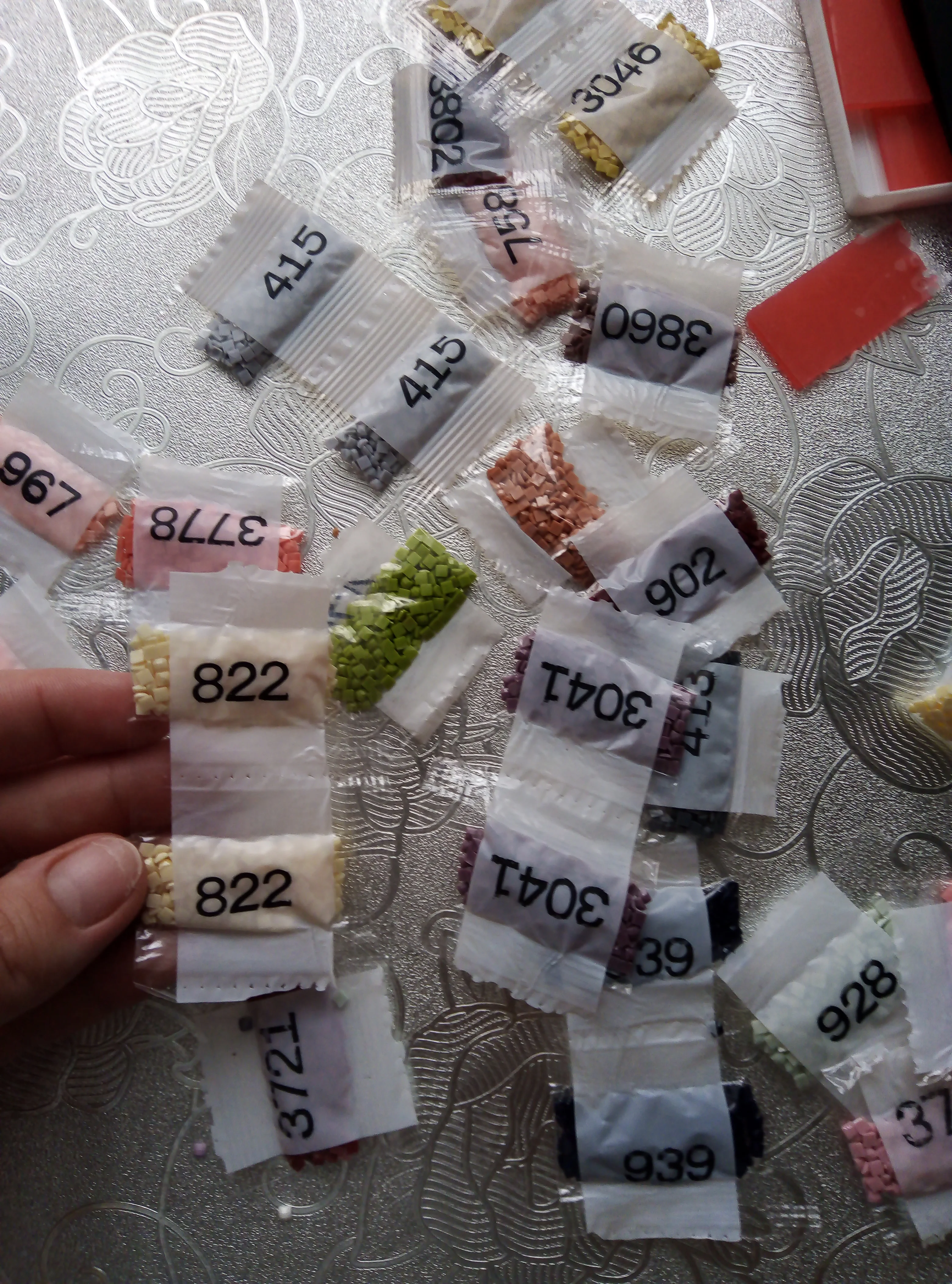 Доставка очень быстрая, до Брянска 3 недели. Фото которое я оправила продавец немного обрезал. Снимаю звезду за их пакеты(.фото где много пакетов) Очень неудобно с ними работать. Хотелось сразу приступить к картине, но пришлось уйму времени потратить пересыпая из их фасовочных пакетов в свои!!! Потому что назад в их пакеты высыпать мозайку неудобно, все рассыпается. По наличию отпишусь позже как выложу фото. Хотелось бы чтобы следующий раз продавец учел замечание по поводу фасовочных пакетов, вроде мелочь, но очень неудобно так работать