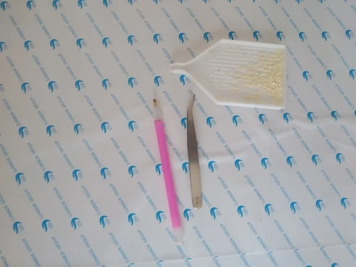 2. Вставьте круглый конец ручки в Дозирующий цемент (нажмите, чтобы сохранить цемент на месте). 3. Используйте круглый конец ручки, чтобы приклеить бриллиант и слегка нажмите, чтобы удалить любой дополнительный цемент. 4. Разорвите частичную пленку и поместите алмаз на холст в соответствии с соответствующим номером. 5. Если вы приклеите алмаз к неправильной области на картине, удалите алмаз пинцетом. 6. После завершения слегка прижмите алмазы рукой или книгой, чтобы убедиться, что алмазы надежно закреплены.