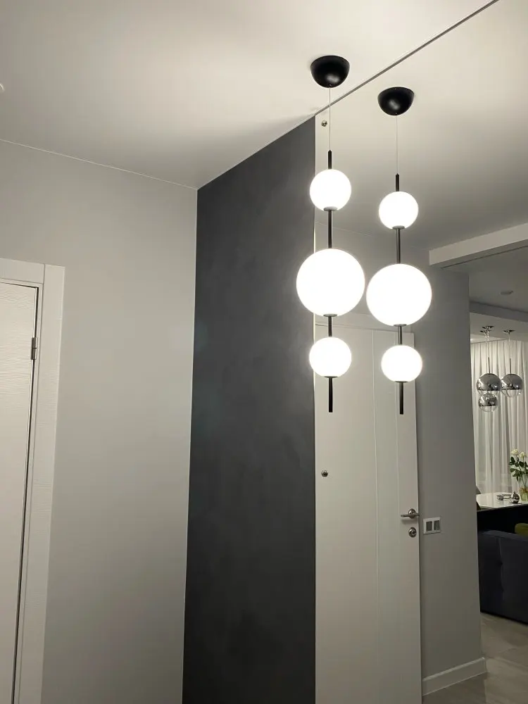 Сразу скажу что не рекомендую покупать эти светильники, в оценках поставил 5 звёзд, т.к. выглядят они как на картинке, а с продавцом удалось решить почти все проблемы, один стеклянный шар один был разбит, один с трещиной и один с окалиной, продавец заменил сломанный и треснувший шары, с окалиной менять отказался, я считаю что это брак, но да ладно, это не самая большая проблема этого светильника. Качество оставляет желать лучшего, в плане отдельных деталей и окраски все не плохо, но в местах соединения сегменты держатся буквально на 1-1,5 витке резьбы, в целом конструкция очень хлипкая и может развалиться если ее случайно задеть. Затягивать сильнее опасно, можно повредить или стеклянный шар или провода. Шары центруются плохо, стекло неоднородное по толщине. Фотографий к сожалению мало, ремонт ещё идёт, а собирать светильники только ради фоток не хочется. Я заказывал 2 светильника, по качеству сборки они одинаковые. За эти деньги советую подобрать что-то ещё. 10 тыс для них дорого