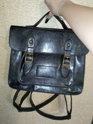 Прекрасная сумка! брала ее исключительно как сумку, а не как рюкзак, буду отстегивать петли на спинке. Красивый состаренный цвет фурнитуры, выглядит как дорогая кожа, жесткая и держит форму. Влезает папка а4, пенал, косметичка, кошелек, зимой еще сменку буду таскать. В общем, удачная покупка!
