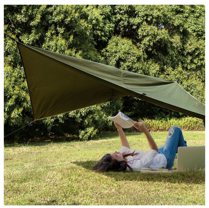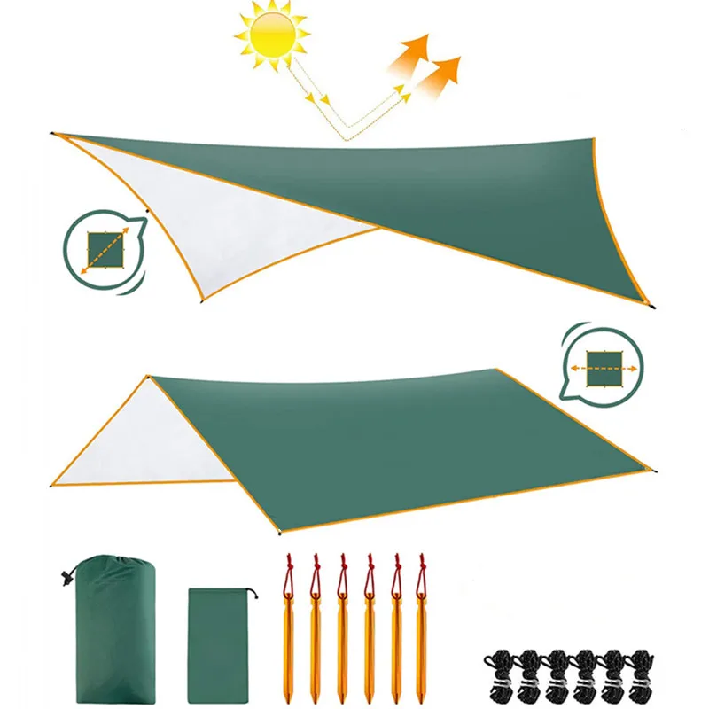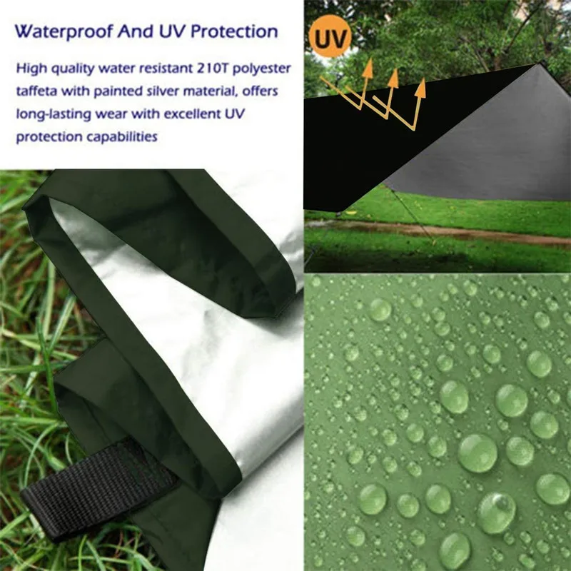 Чтобы насладиться более комфортным отдыхом в кемпинге, необходимо подготовить палатку брезентом, если меньше, чем идеальная погода, нравится дождь и тяжелое солнце. Многоцелевой Водонепроницаемый Гамак брезент может соответствовать всем вашим потребностям для ваших приключений на открытом воздухе. Он не только защищает вас и ваше снаряжение от солнца и дождя, но и обеспечивает просторное пространство, чтобы насладиться путешествием. Его можно использовать как укрытие гамака, место для палатки, наземный лист, мгновенный оттенок, базовый лагерь и идеально подходит для пеших прогулок, кемпинга, пикника или пляжа.