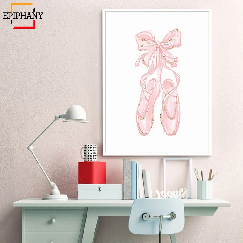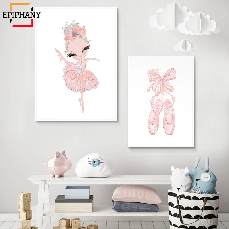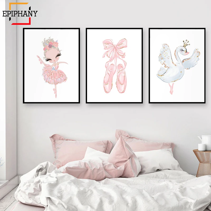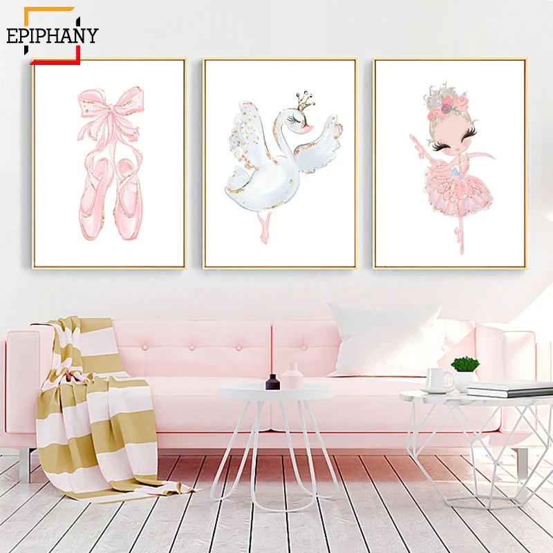 Детские балерины для маленьких девочек; Розовые балетные тапочки принцессы с изображением лебедя; Парусиновые тапочки с принтом для детской комнаты; Картина в скандинавском стиле