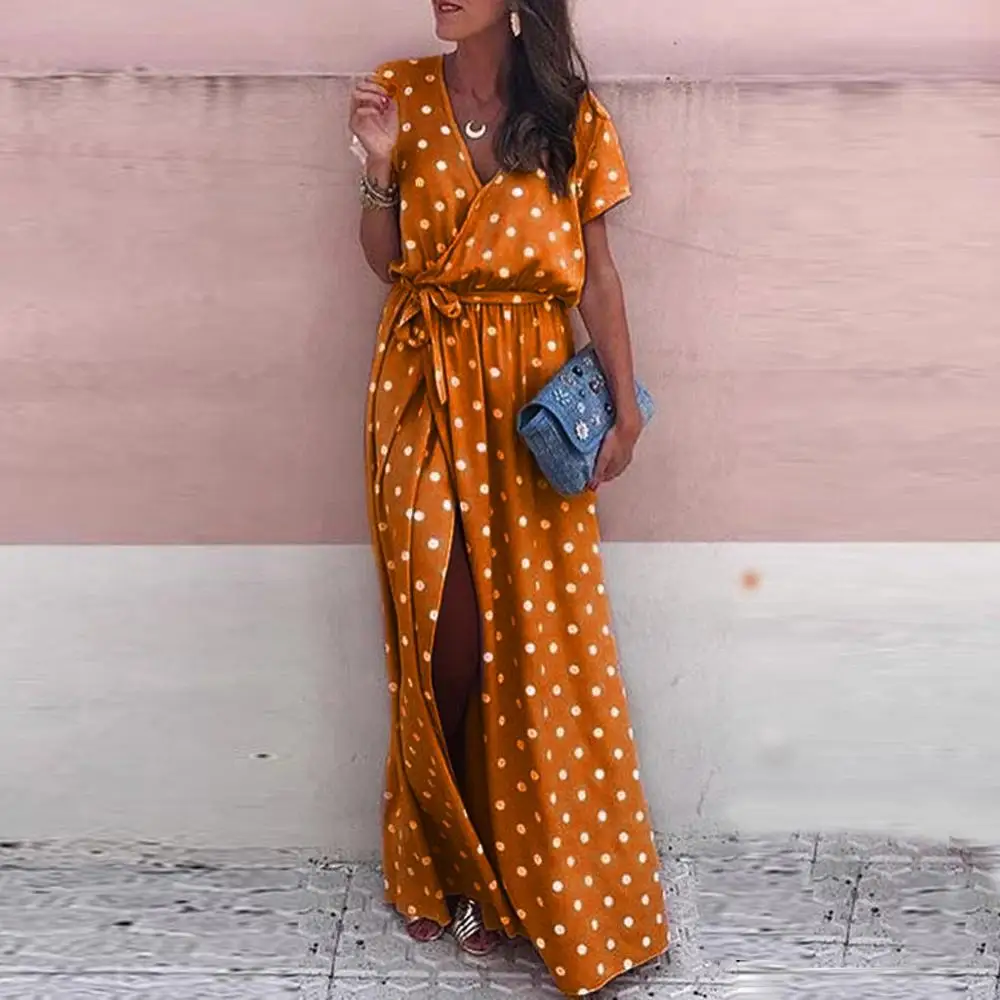 Женское длинное платье в горошек, розовое волнистое Платье макси с V-образным вырезом и разрезом