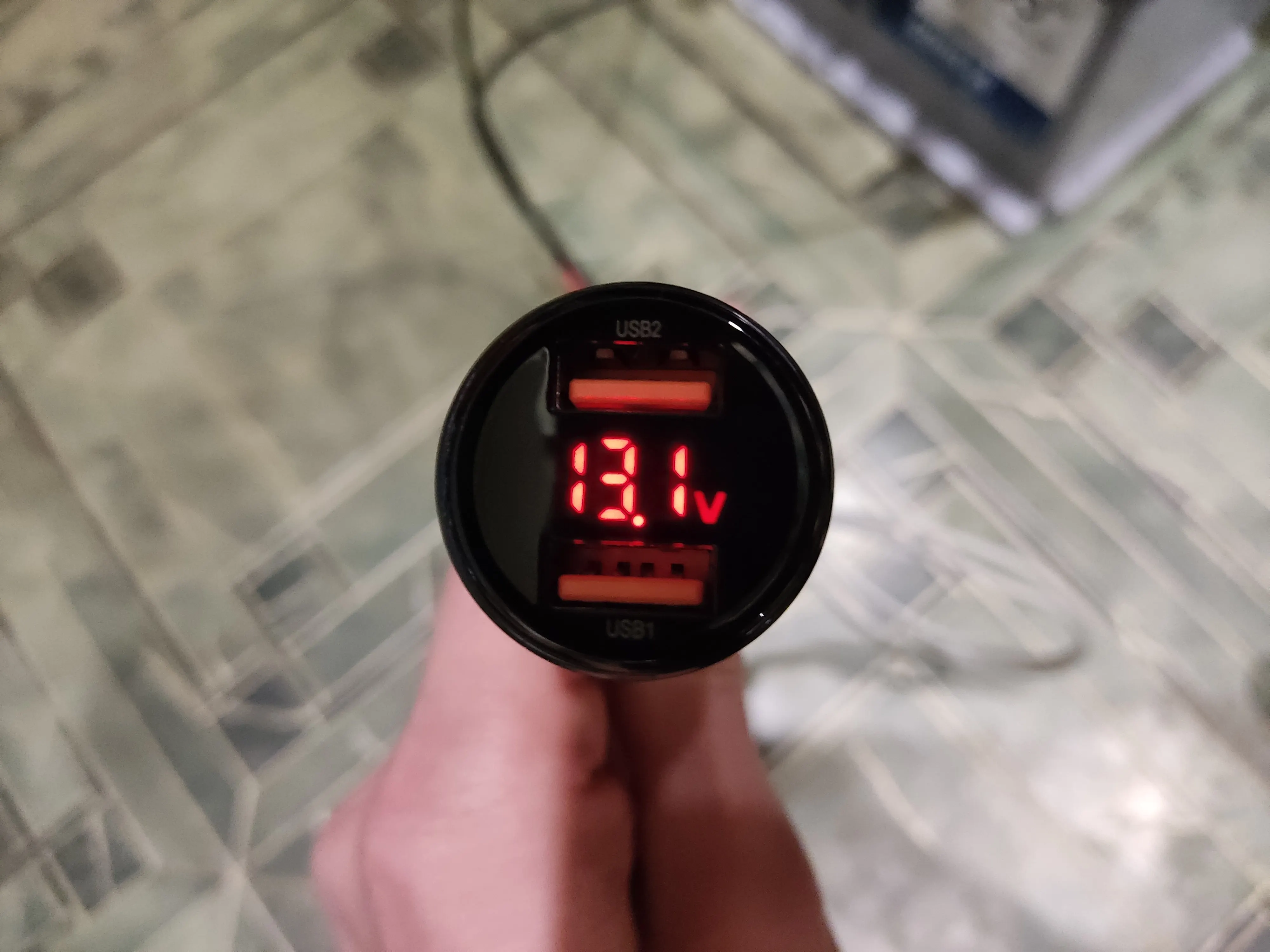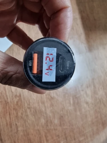 Очень хорошее качество изготовления. Мой экземпляр занижает показания на 0.1 вольт в диапазоне 11-15 вольт, что вполне приемлемо. При подключении телефона начинает поочерёдно показывать напряжение бортовой сети, напряжение зарядки, ток зарядки с соответствующей индикацией: A - для тока V - для напряжения. Яркость индикатора приятная и ненавязчивая, но, в то же время, показания неплохо считываются и на свету.
