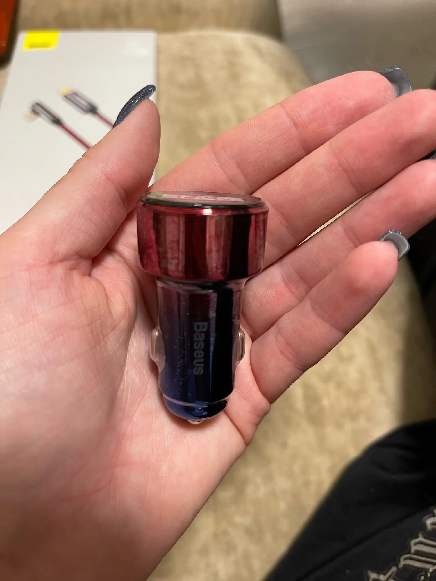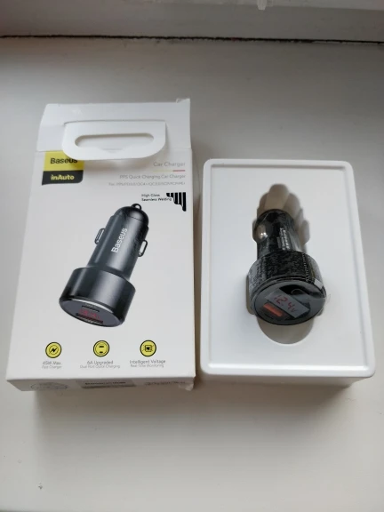 Здравствуйте, товар соответствует описанию, заряжает хорошо за (2 мин 3% с шнурком от Baseus за 150 руб.). Влез в прикуриватель мазды 3 без проблем, сидит крепко, подсветка глаза не режет. Так что товар годный. P.S. Если что дополню отзыв