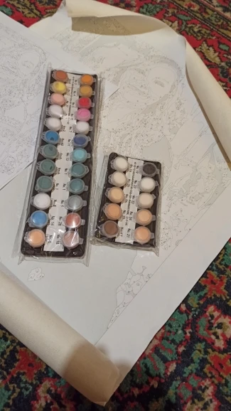 Заказ пришёл за месяц. Краски качественные и в достаточном количестве. Немного не четкие рамки, так что многие элементы надо прорисовать карандашом. В целом все понравилось.