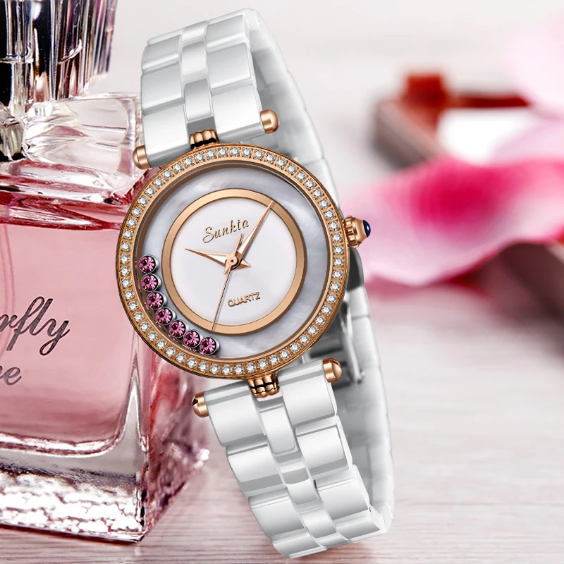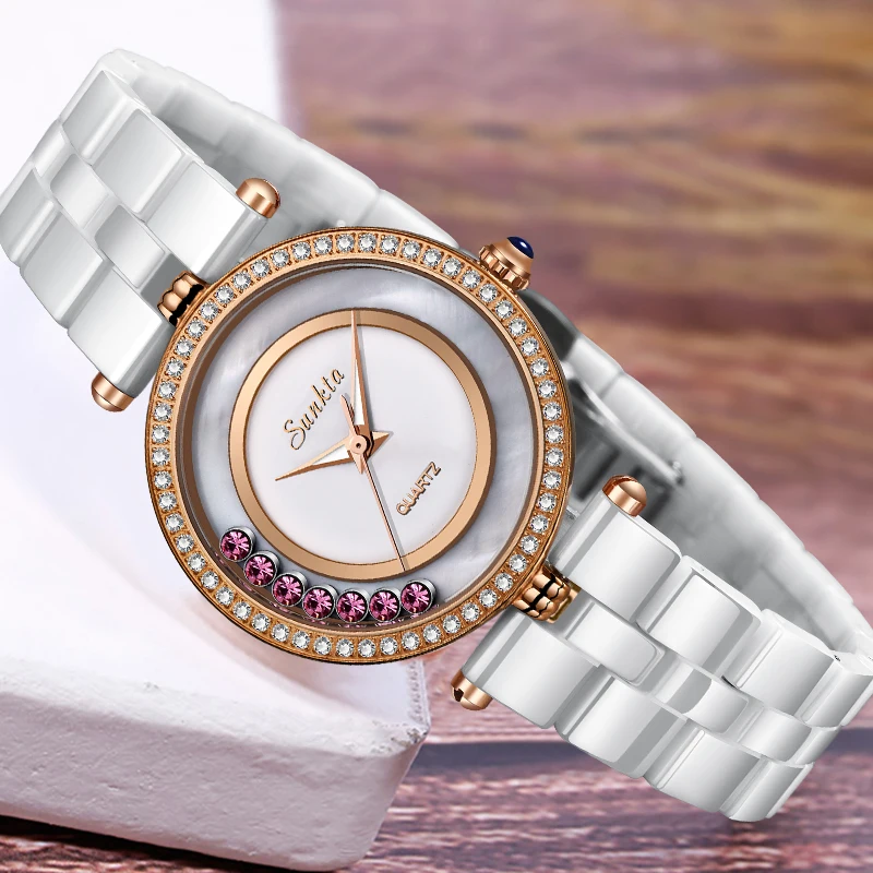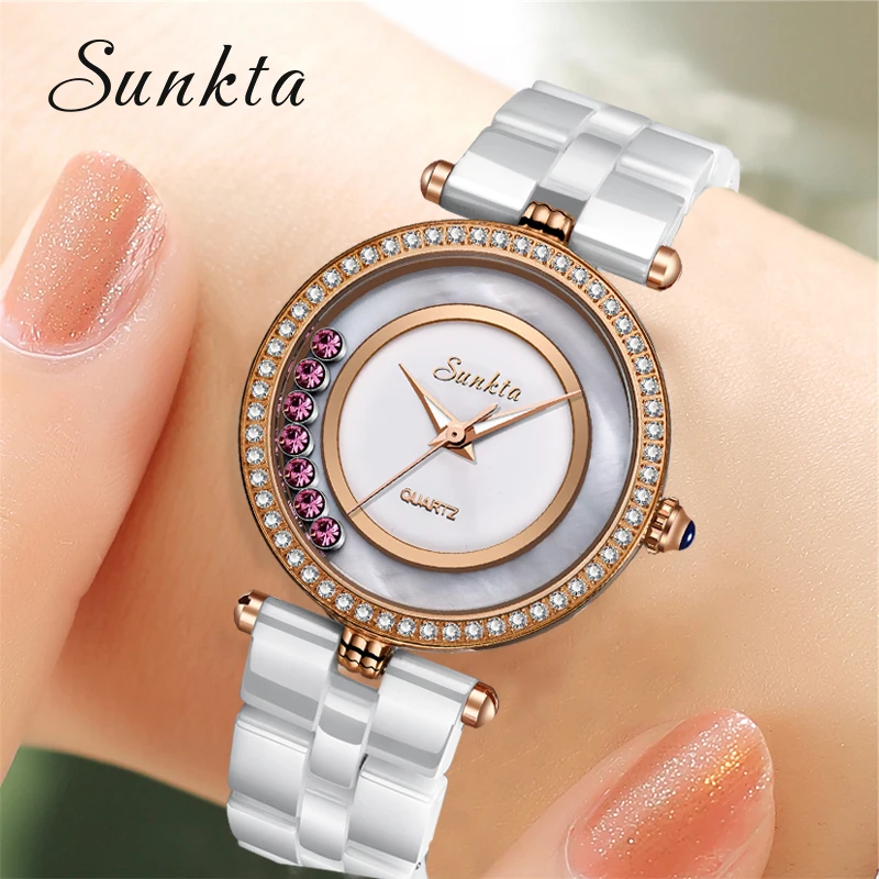 Часы наручные SUNKTA женские кварцевые, брендовые роскошные керамические водонепроницаемые Модные с перламутровой поверхностью, с бриллиантами, 2021