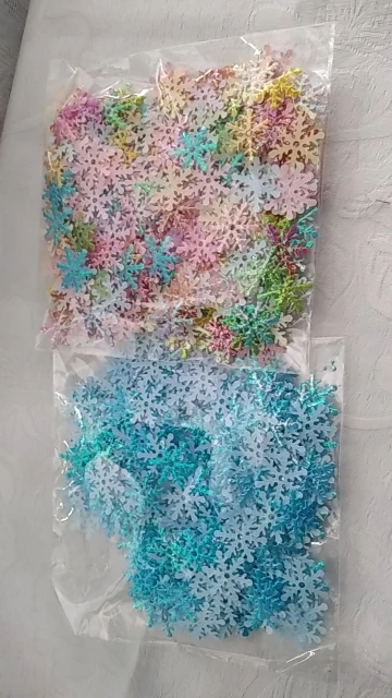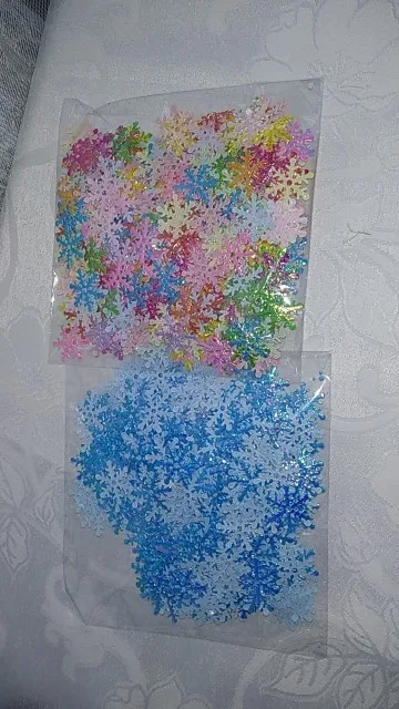 я заказала снежинки трёх цветов голубые,золотые и перламутровые.они маленькие но,но очень милинькие.для детских зимних поделок самое то,будет очень красиво смотреться.