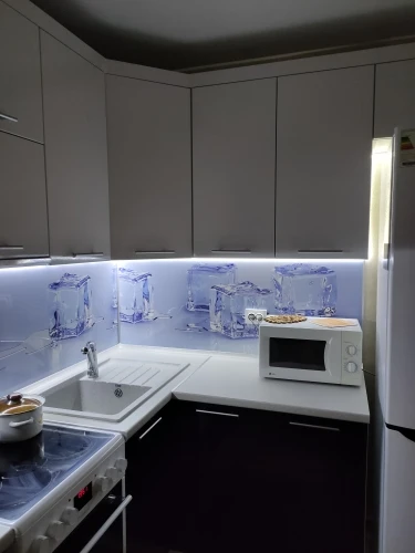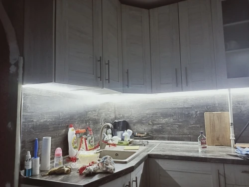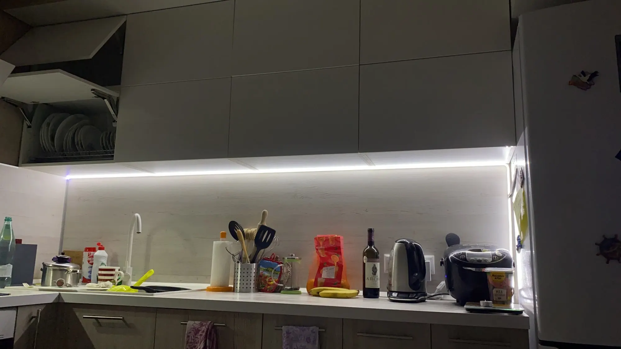 На кухне пока монтировать не стали, зато теперь дает теплый приглушенный свет над диваном