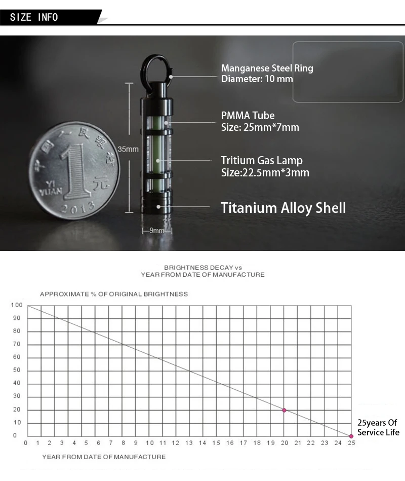 Так себе. Мои ожидания были больше. Я не уверен, что корпус из титанового сплава, моя оценка-алюминий, но ок. Трубка фиксируется внутри корпуса только силиконовым кольцом, не безопасно. В описании указано, что непрерывное самосветящееся в течение 25 лет, но на товаре указан только 10 лет непрерывного самосветящегося. В конце трубка не блестит, как на фотографиях. Излучающий свет тусклый, определенно не могу использовать его в качестве спасательных аварийных огней для наружного инструмента выживания.