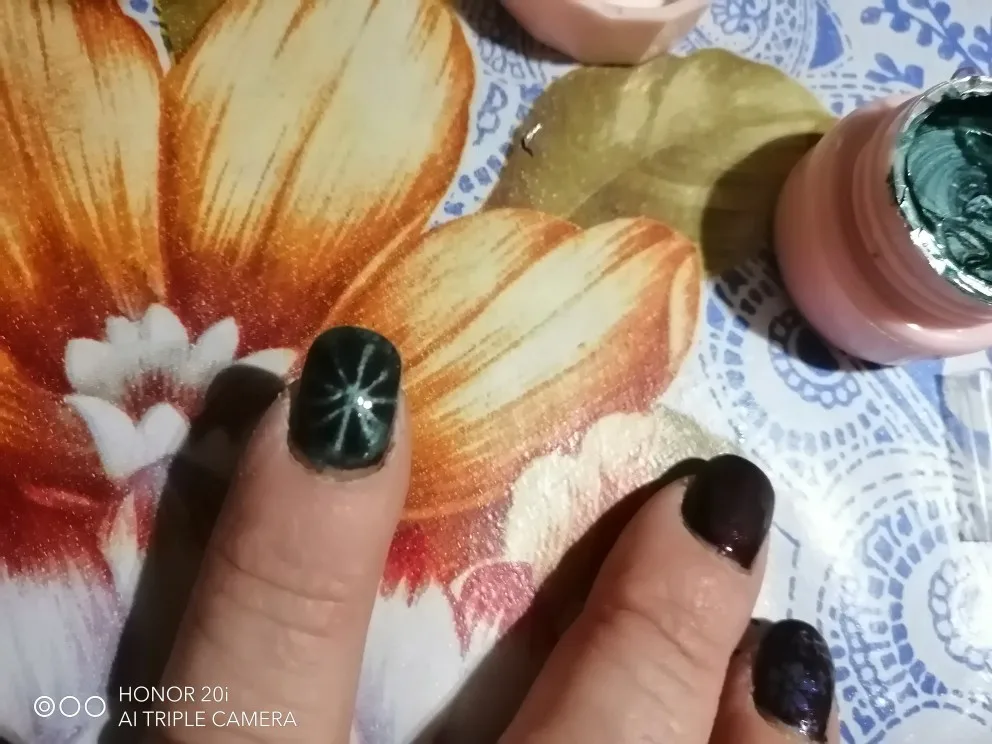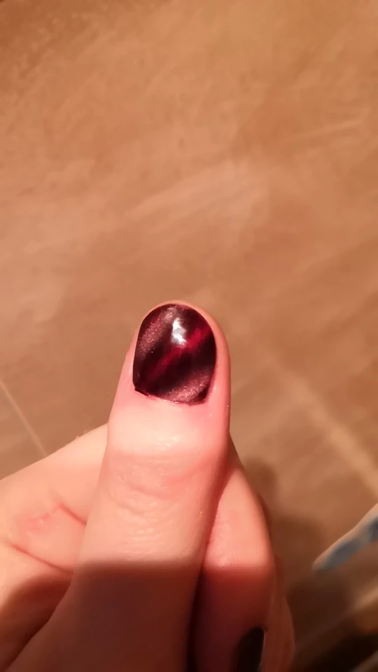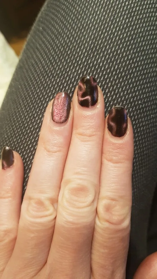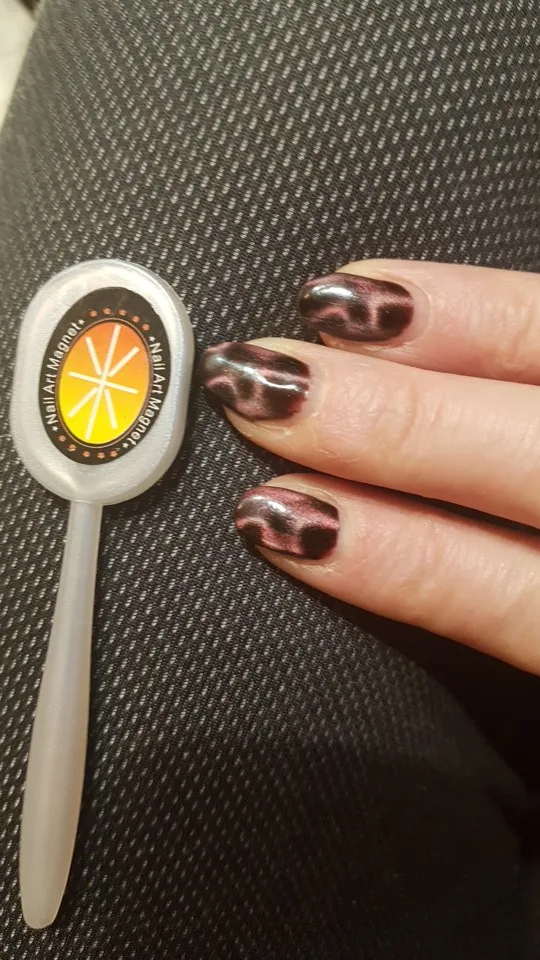 Жутко неудобная упаковка. Больше никогда не куплю отдельные коробочки без кисточек. Только флакончики с встроенной кисточкой! Еще надо приноровится работать магнитом. Тонкий проблеск наискосок получается хорошо. а вот чтобы пятно получилось или широкая полоска во весь ноготь - ну никак, ноготь чернеет, весь металлик куда-то девается. В итоге плюнула и прикладывала магнит, который должен был 8 лучей выходящих из одной точки сделать. А то что получилось - на фото. Явно не то, что хотелось, но тоже прикольно.