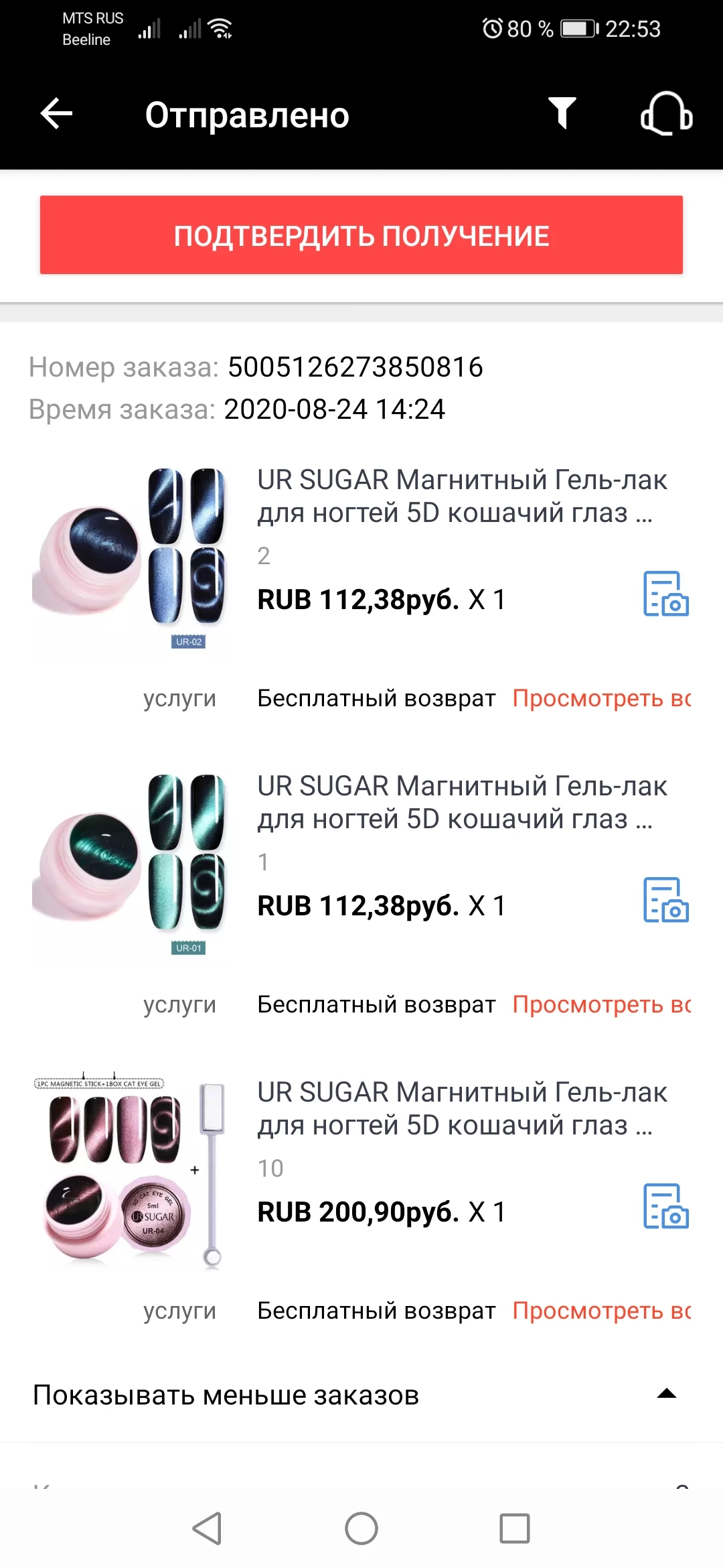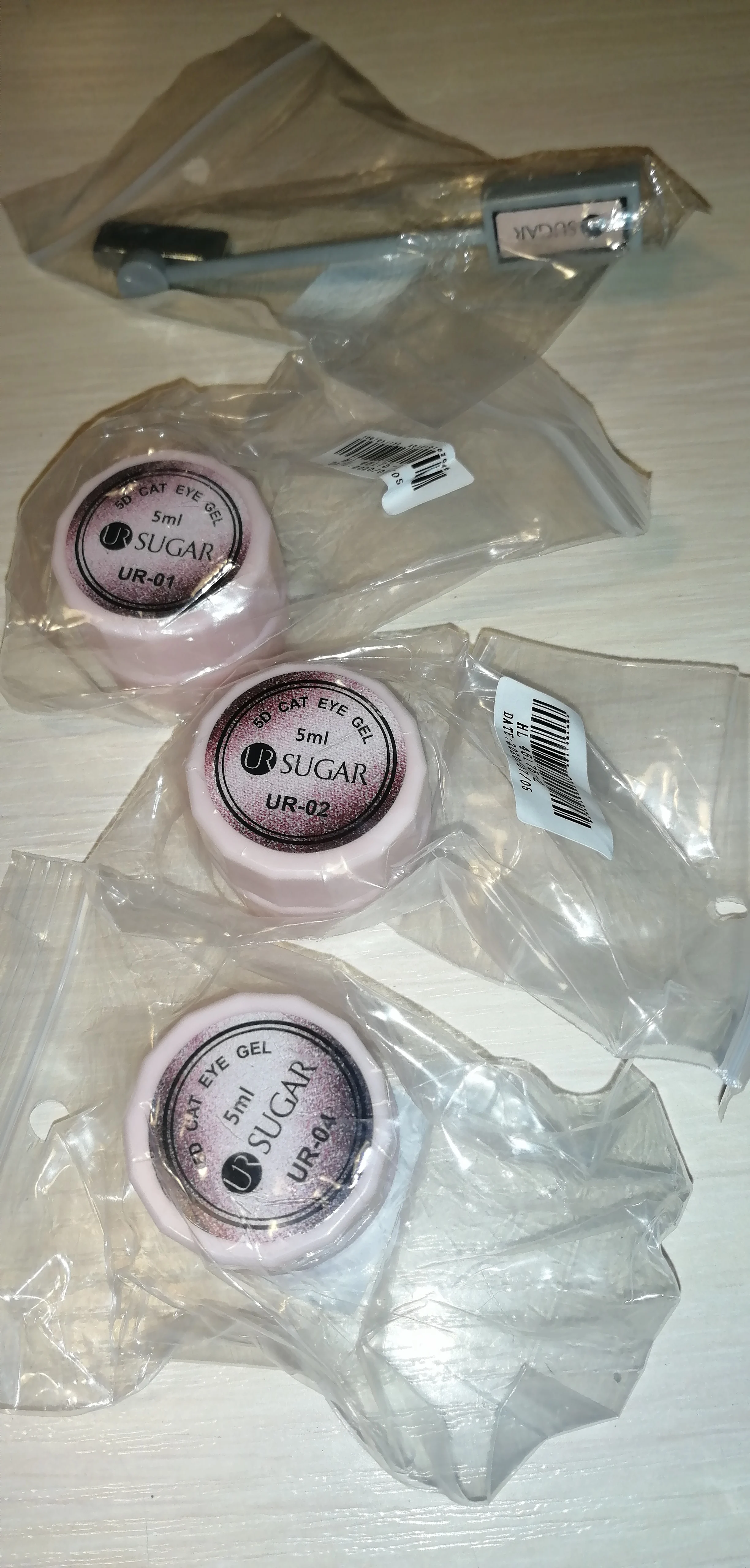 Заказывала 24 августа. Посылка шла до Волгограда 2 месяца, хотя я в этот день делала много заказов : Рюкзак с Led экраном, фреза для маникюра, кисточки (всё это пришло ещё месяц назад). Продавец был на связи, информация о доставке была скрыта, отследить невозможно, пришла посылка нежданно, спасибо почта России извещение прислали. Заказывала 3 позиции (UR-01, UR-02 и набор 10, в него входит UR-06 + магнит). В итоге прислали UR-01, UR-02 и набор 9, в него входит UR-04 + магнит. Пробовала на типсах вроде нормально, магнит сильный. Единственное, что огорчило - это очень долгая доставка и не тот оттенок.