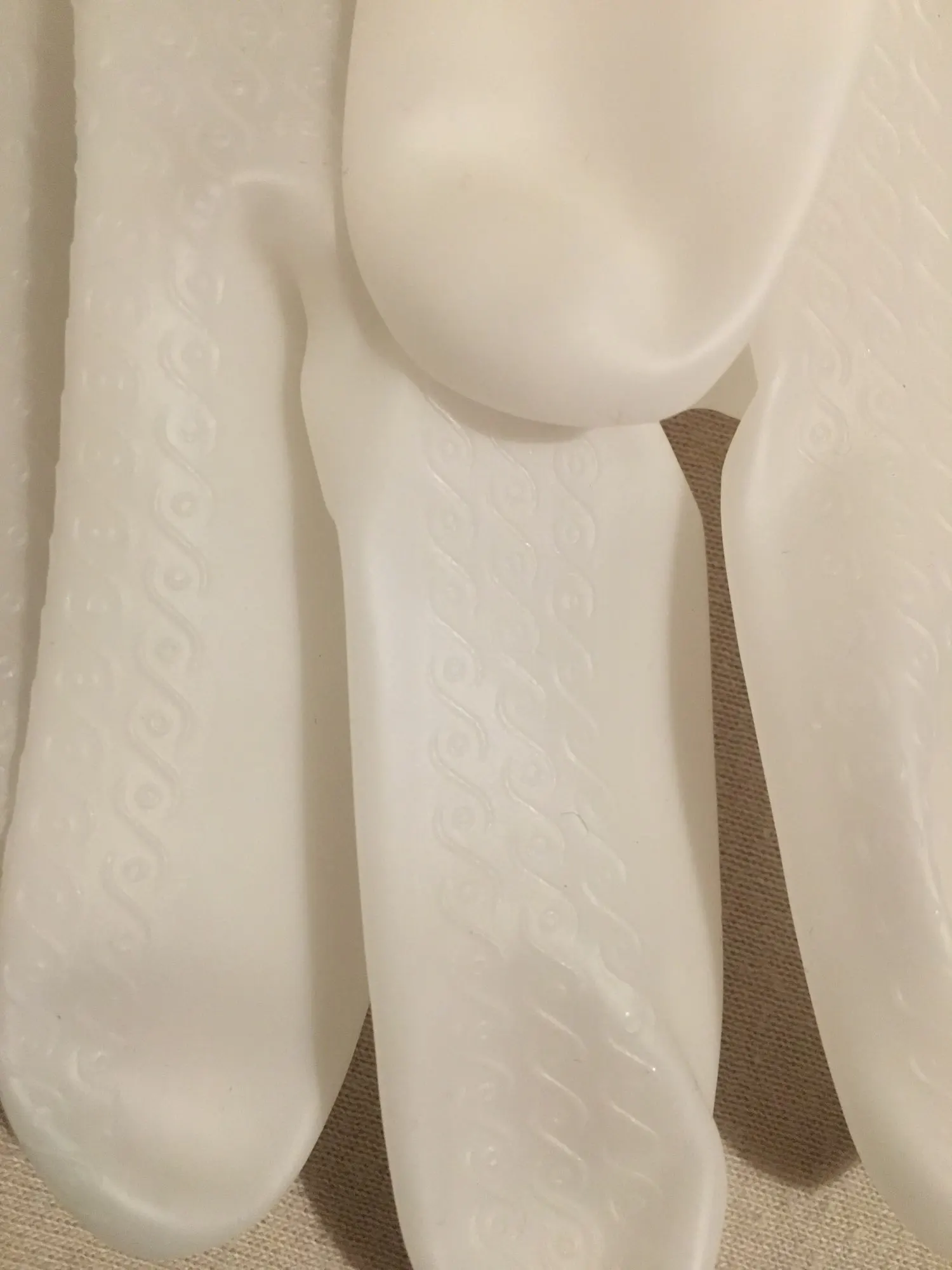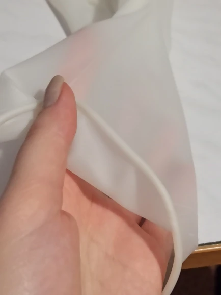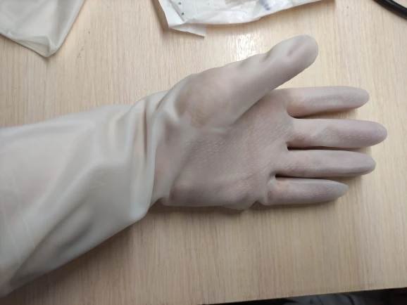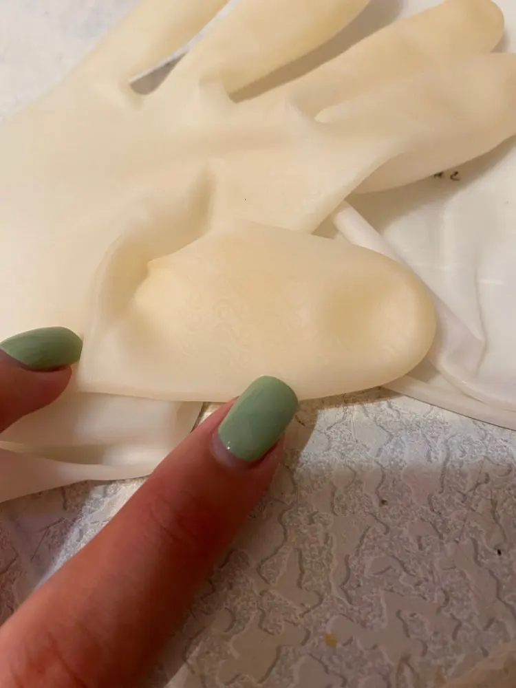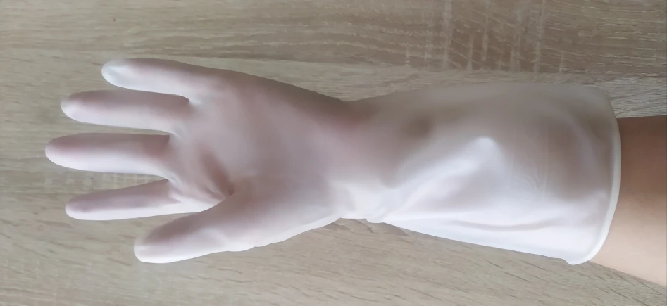 перчатки молочного цвета полупрозрачные размер китайский на размер меньше еле натянула качество хорошее не пожалеете.