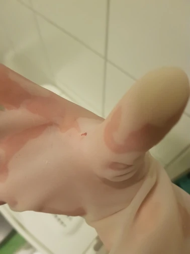 Перчатки в активном использовании 3 недели. Мою посуду. Пальчики на перчатках стали желтоватые. Но сами перчатки могу пока рекомендовать. Не рвутся. Надеюсь, ещё долго будут целыми. Единственное НО: руки не то чтобы потеют, но доставать из перчатки руку получается не быстро - прилипают внутри.