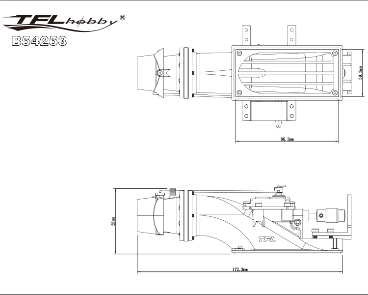 Размеры: Длина 176 мм (без рулевого механизма, двигателя), ширина 80 мм, высота 50 мм