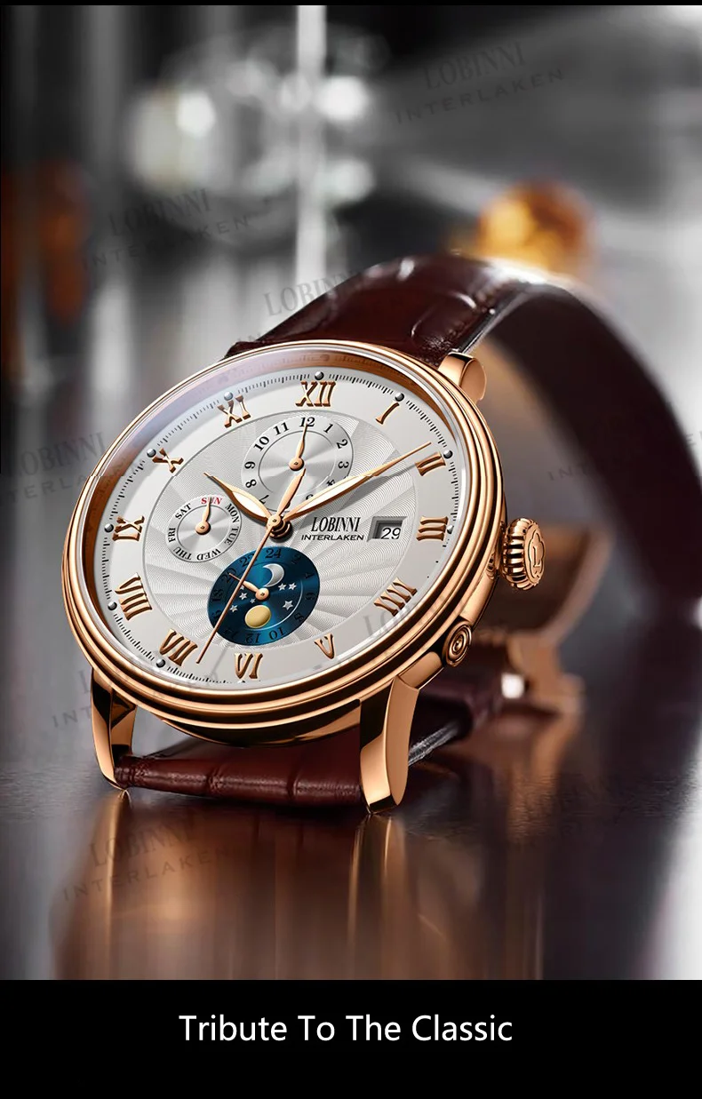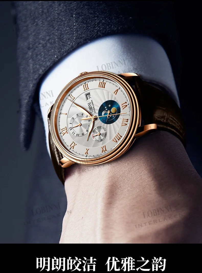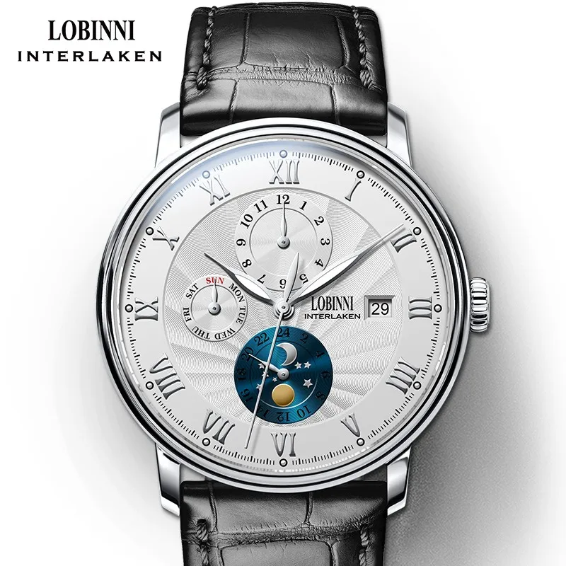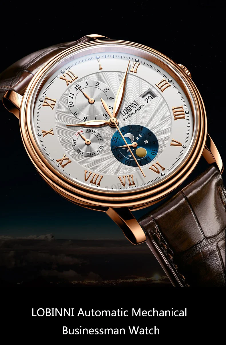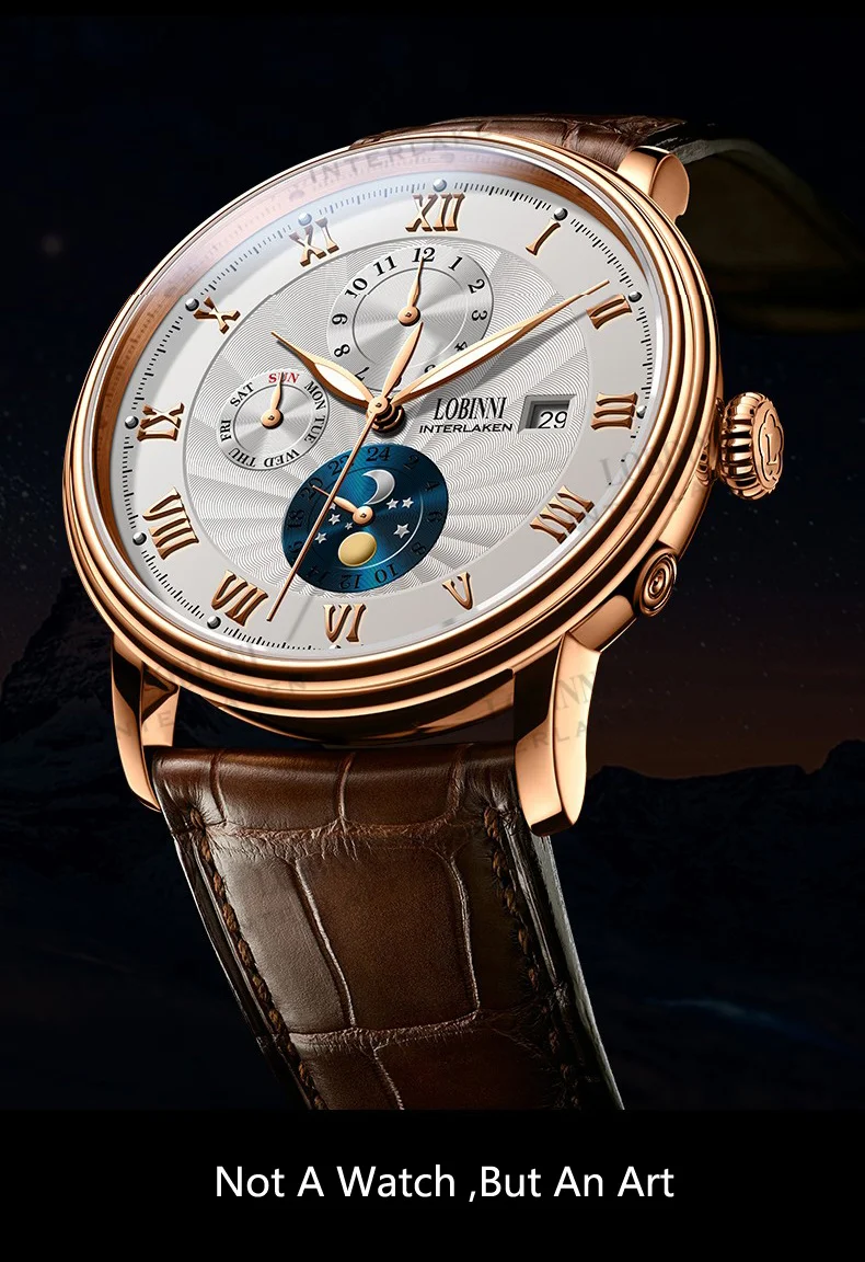 Часы LOBINNI Мужские автоматические механические, швейцарские роскошные брендовые многофункциональные с сапфировой луной, ST3A, L1023B