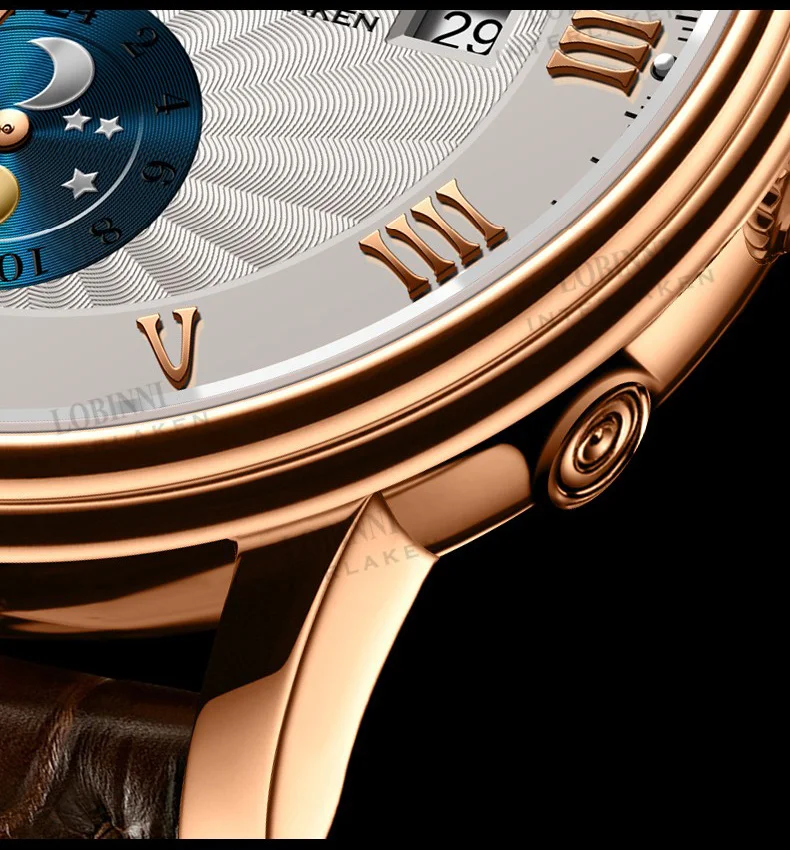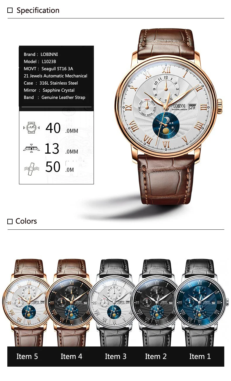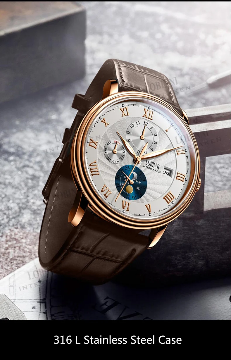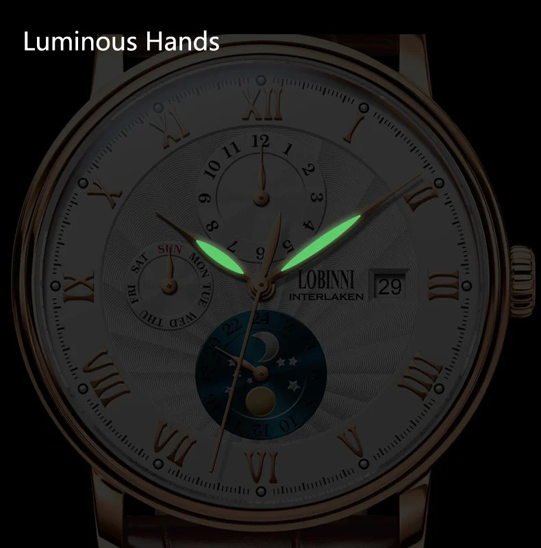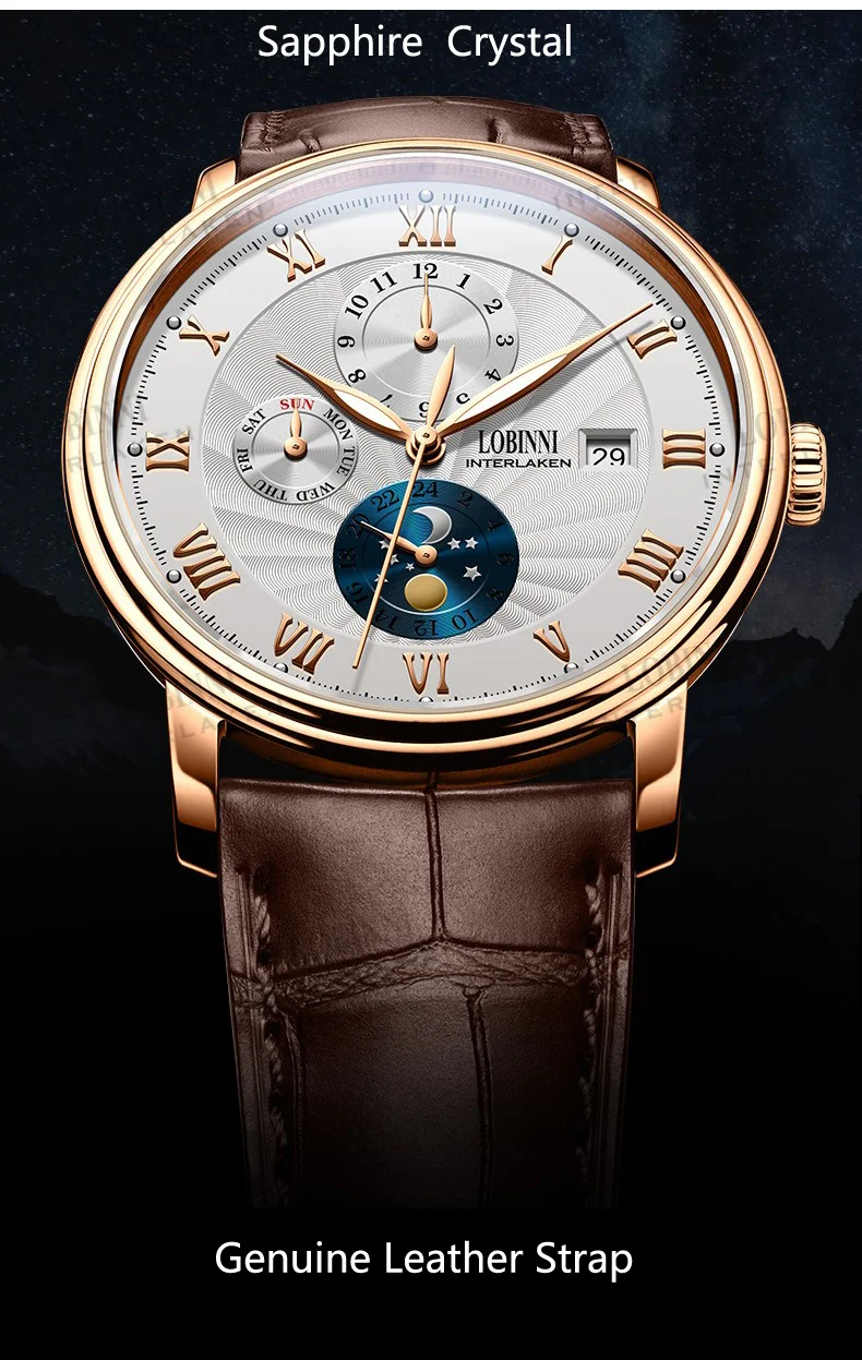 Часы LOBINNI Мужские автоматические механические, швейцарские роскошные брендовые многофункциональные с сапфировой луной, ST3A, L1023B