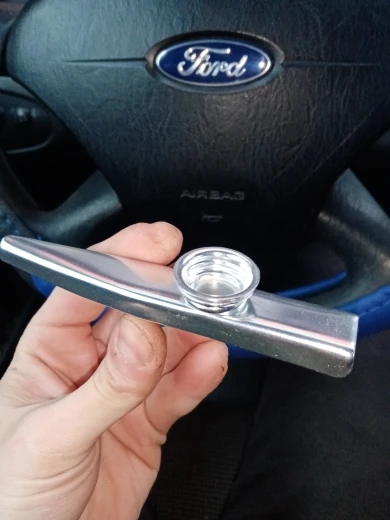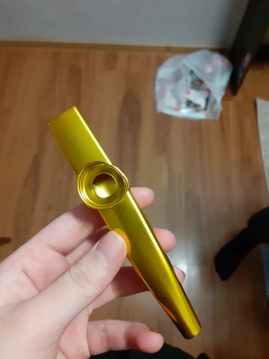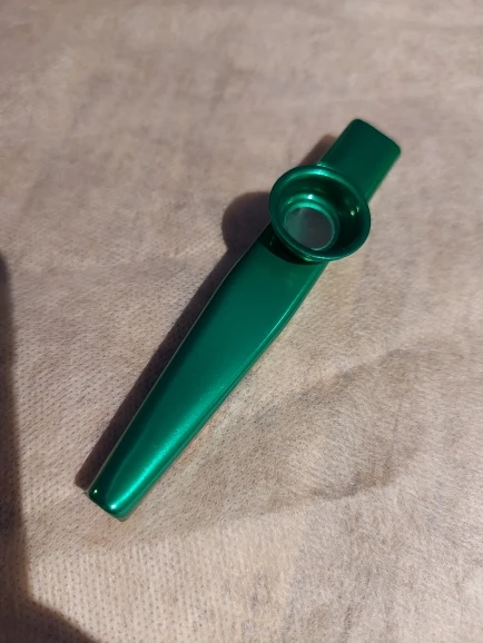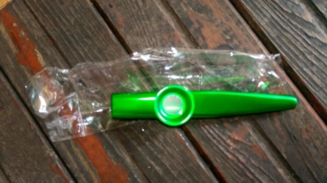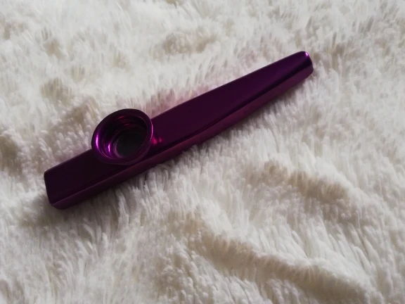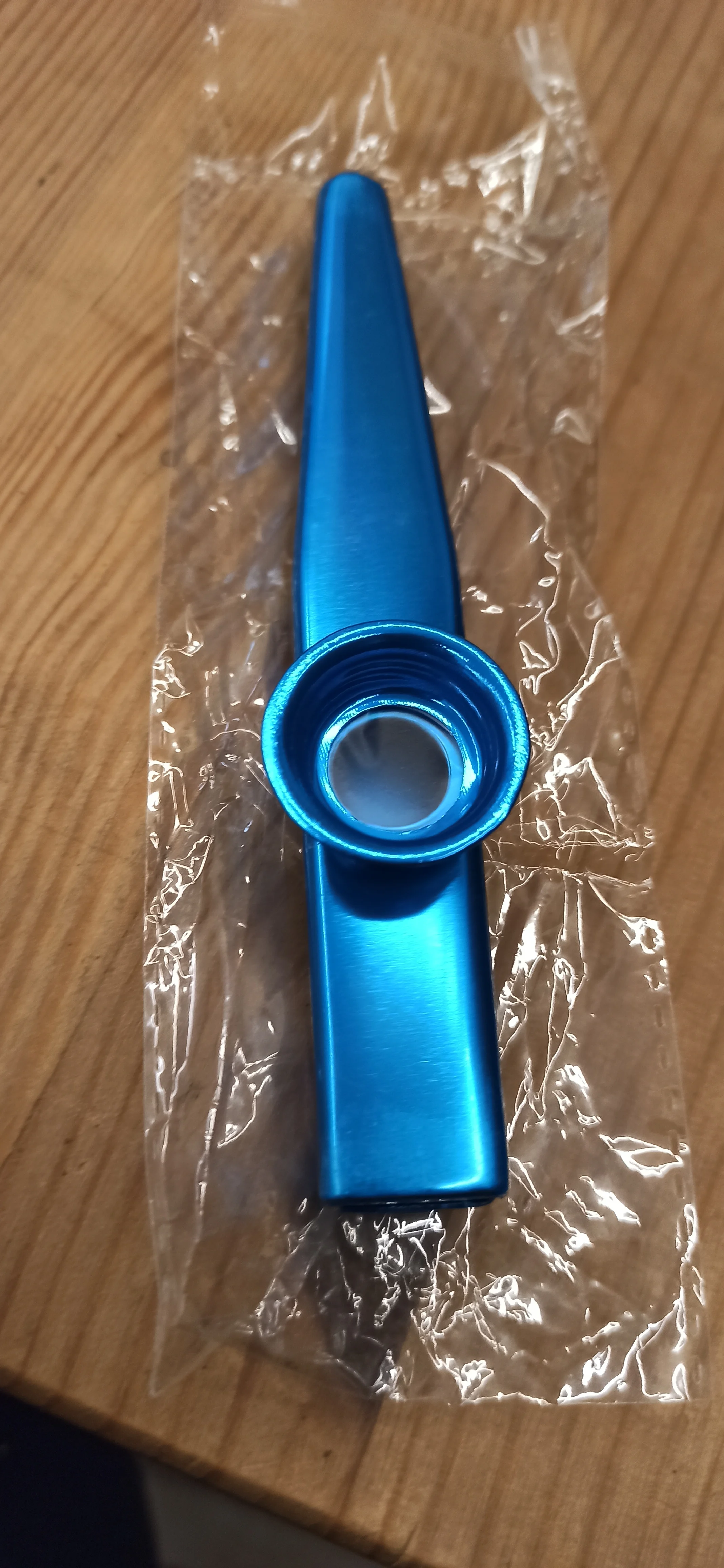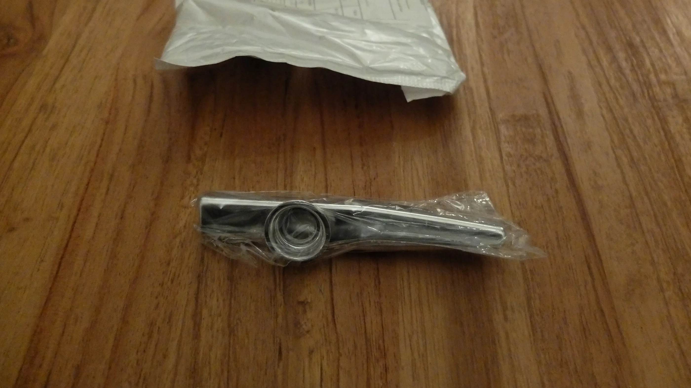 Казу прибыл. Ничего так музыкальный инструмент, только какой-то хлипкий, детали болтаются. С одной стороны есть вмятина (см. на фото). Разобралась не сразу - нужно подкрутить или ослабить закрутку, где лежит мембрана. Чем свободнее, тем сильнее вибрирует и проявляет специфический тембр.