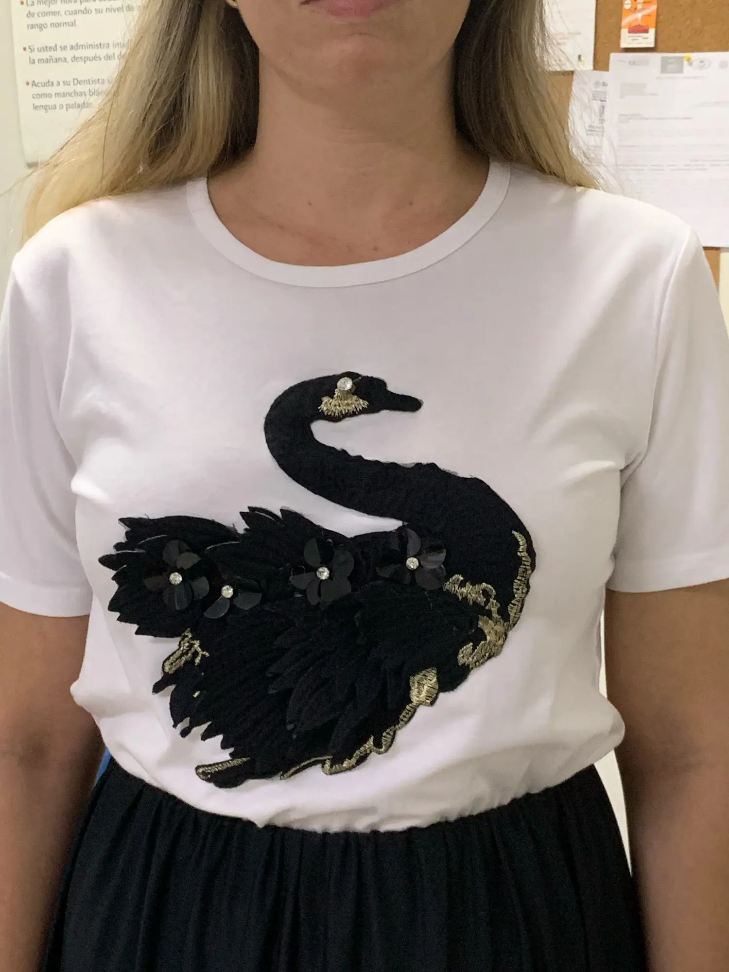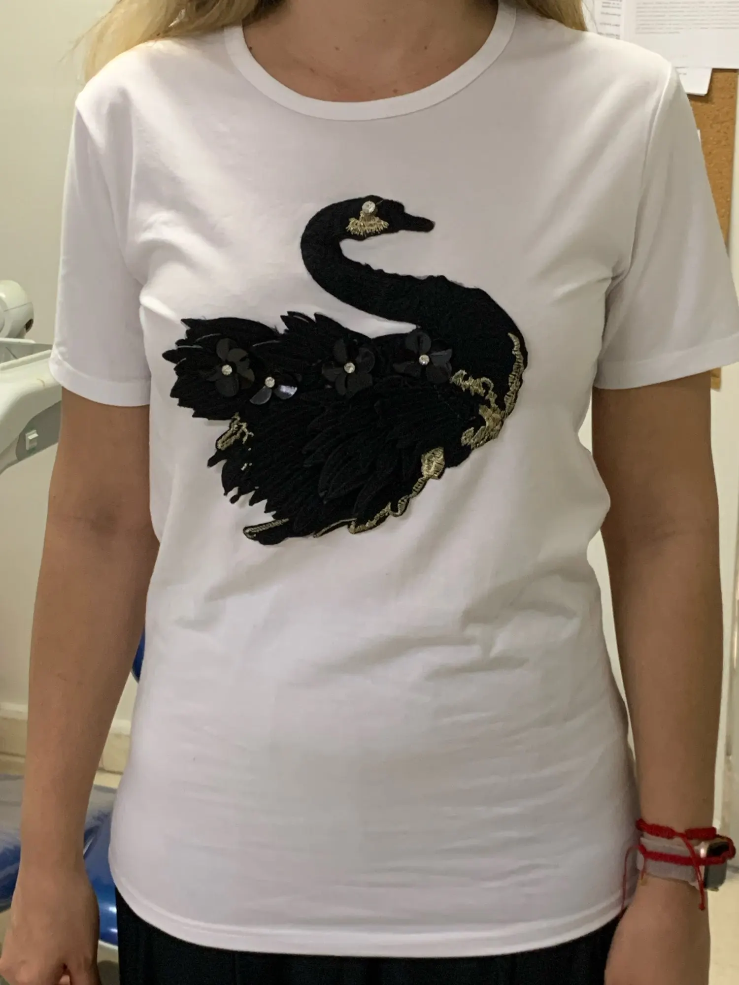Новинка 2021, модная Милая футболка с вышивкой лебедя, женская брендовая футболка, Повседневная Свободная футболка с коротким рукавом и круглым вырезом, женские топы с изображением лебедя