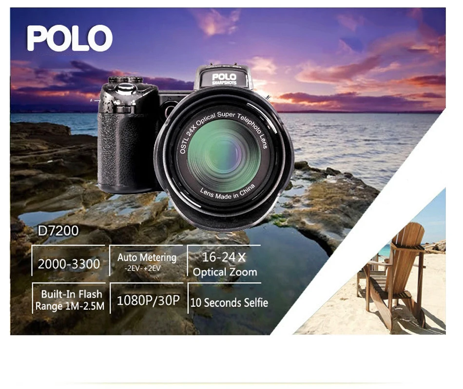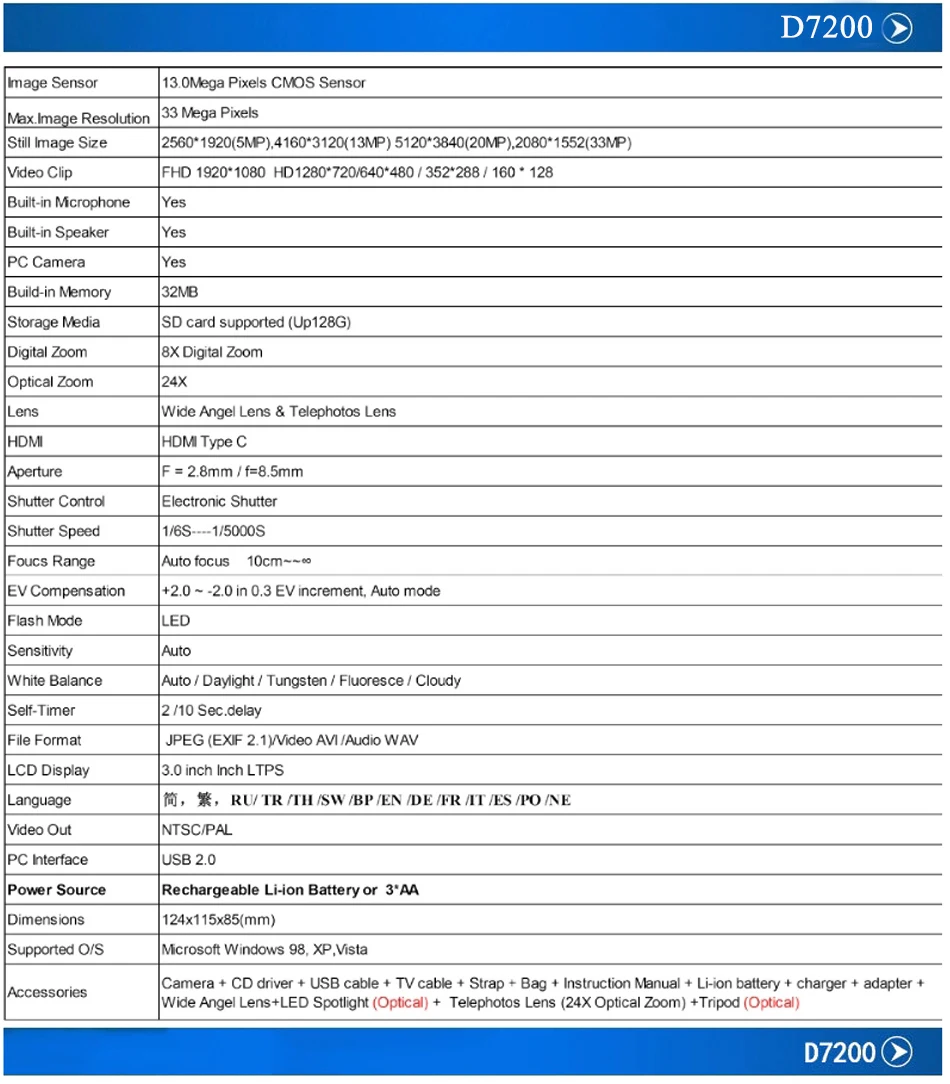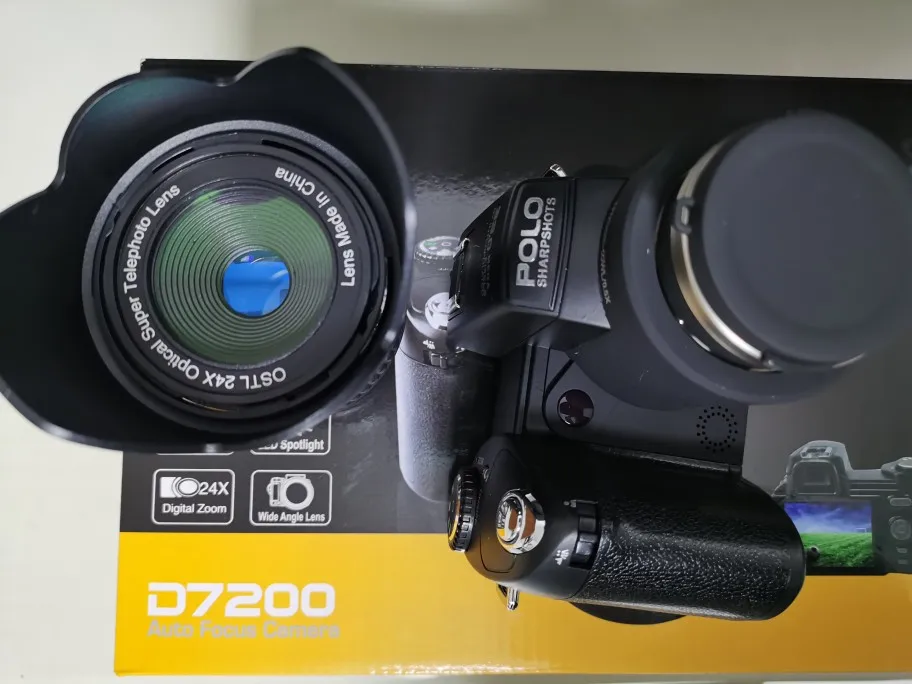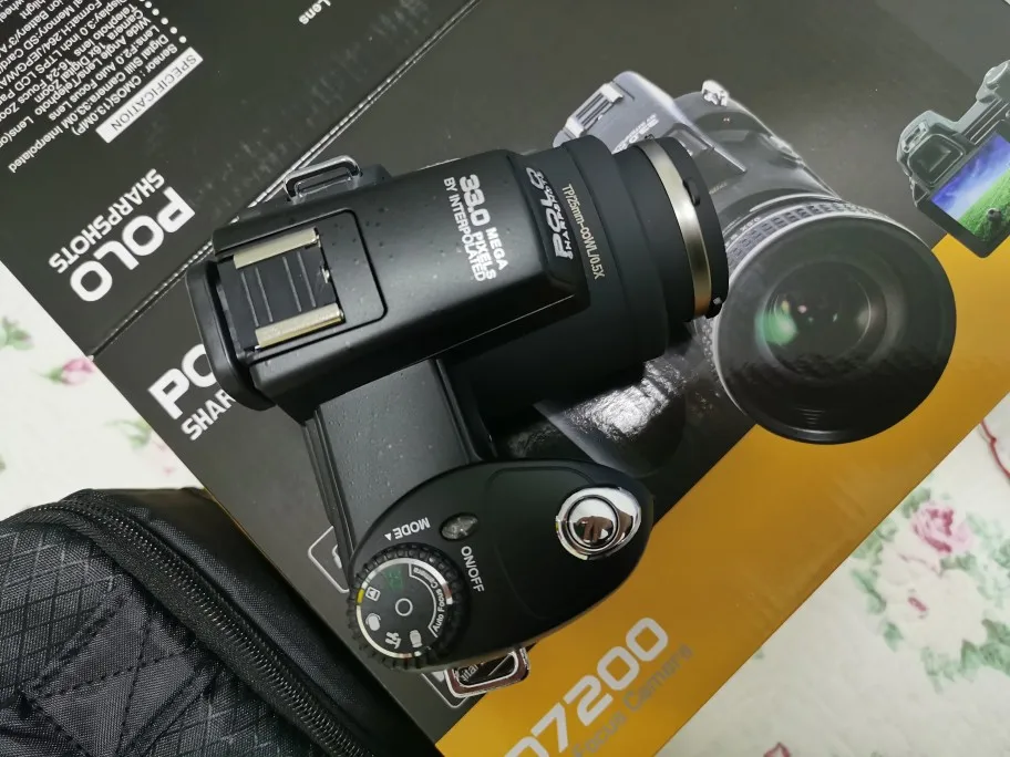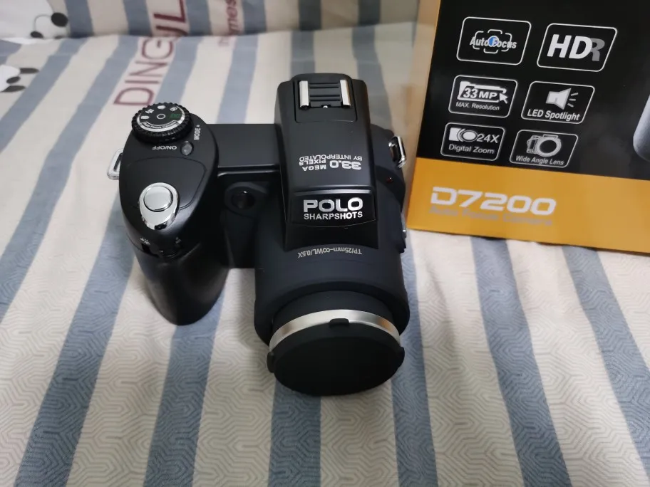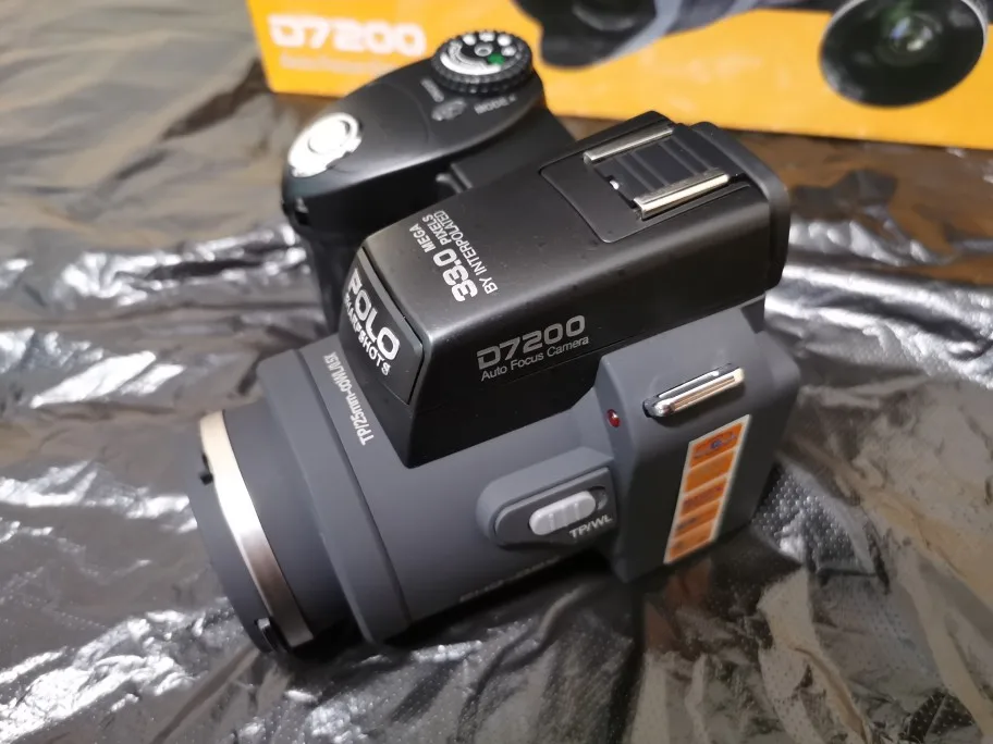 PoloD7200 – это фотодатчик от китайского телефона, помещенный в красивый корпус псевдозеркалки с тремя линзами-насадками без какой либо автоматической фокусировки и без возможности контролировать основные параметры съемки, создающий очень плохое качество изображения. Емкость аккумулятора указанная в инструкции не совпадает с емкостью написанной на самом аккумуляторе. Дисплей прикрыт очень тонким пластиком, и, если на него слегка надавить – видно как кристаллы начинают ‘плавать’. Дисплей имеет 230.400 пикселей (960*240) Есть и встроенная вспышка, для активации которой ее нужно поднимать вручную, никакой кнопки для этого не предусмотрено. Вспышка маломощная, при съемке со вспышкой зазор между тестовыми импульсами и основным импульсом очень большой.Одна из них – возможность снимать с максимальным размером фотографии на 33 мгп. Вот только беда в том, что 33 МП – это чистой воды интерполяция. Матрица камеры имеет только 5 ‘чистых’ мегапикселя (2560 Х 1920), которые программно раздуваются