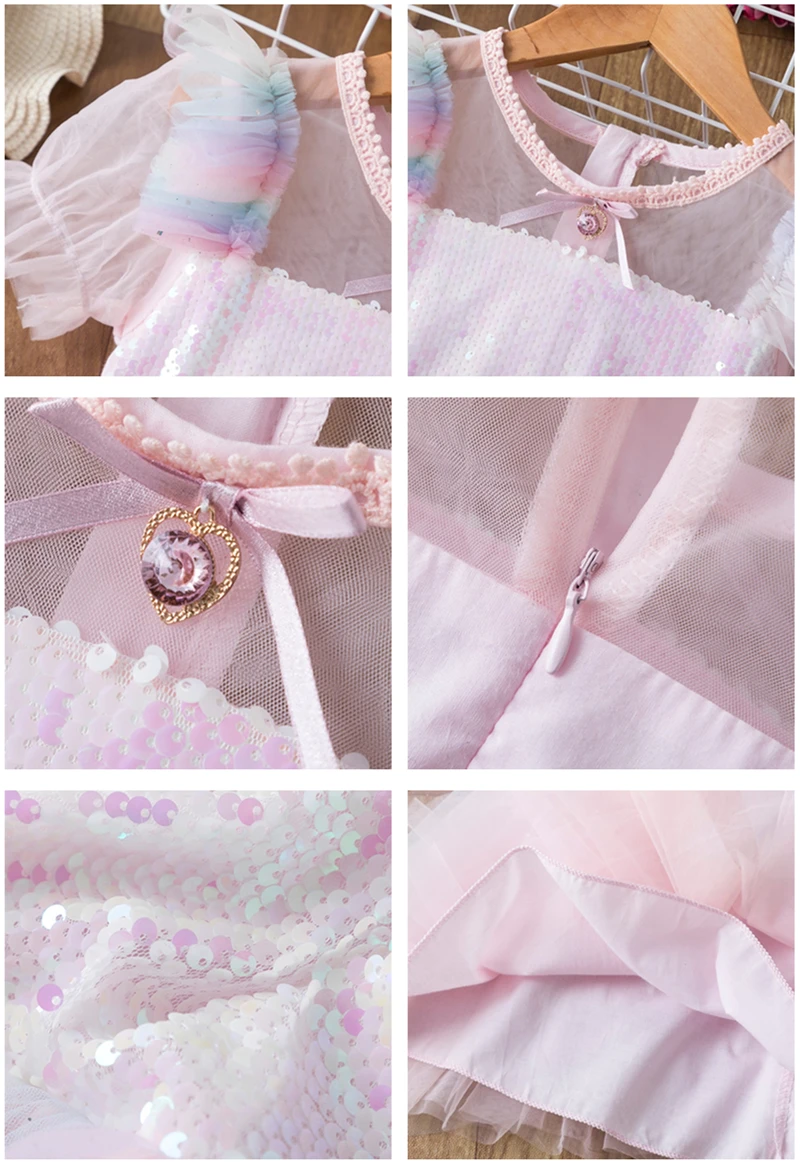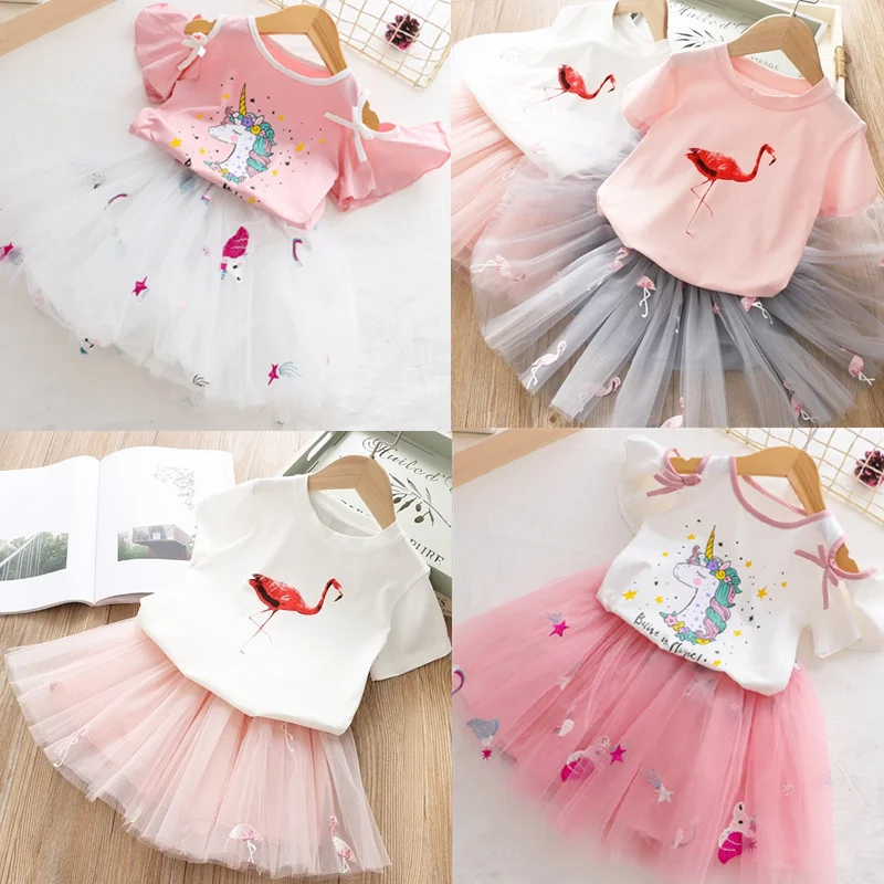 Комплекты одежды для девочек, лето 2021, топ принцессы с принтом фламинго и звезды + платье с единорогом, комплект из 2 предметов, детская одежда, платья