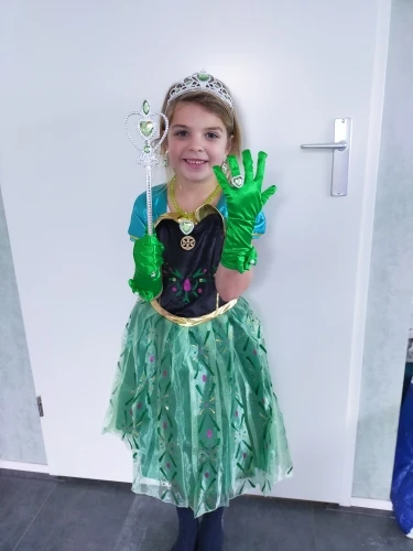 het kwam op tijd binnen en mijn dochter is er helemaal blij mee! stof voelt goed aan en het ziet er heel mooi uit. Enige minpuntje is dat de kleur van de handschoentjes niet dezelfde kleur heeft als de jurk. Maar dat ziet mijn dochter niet.