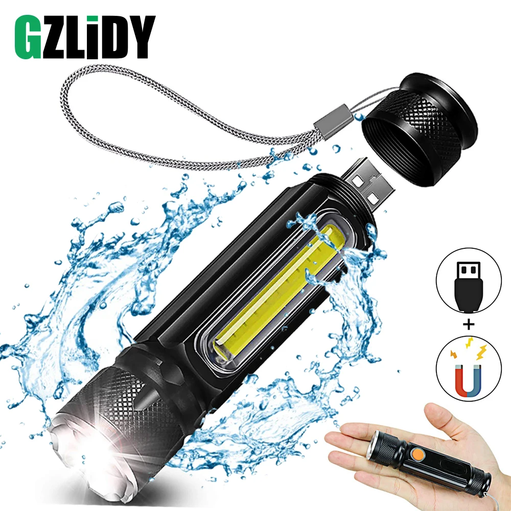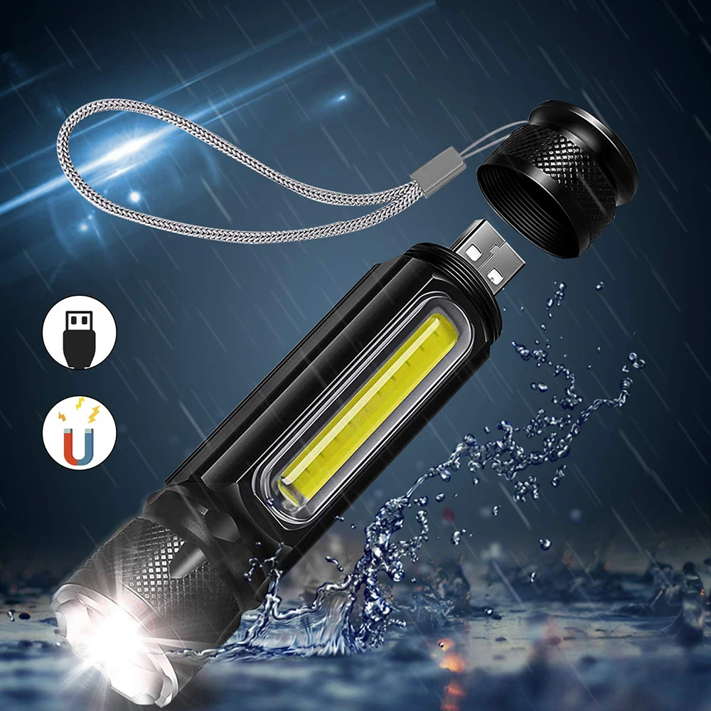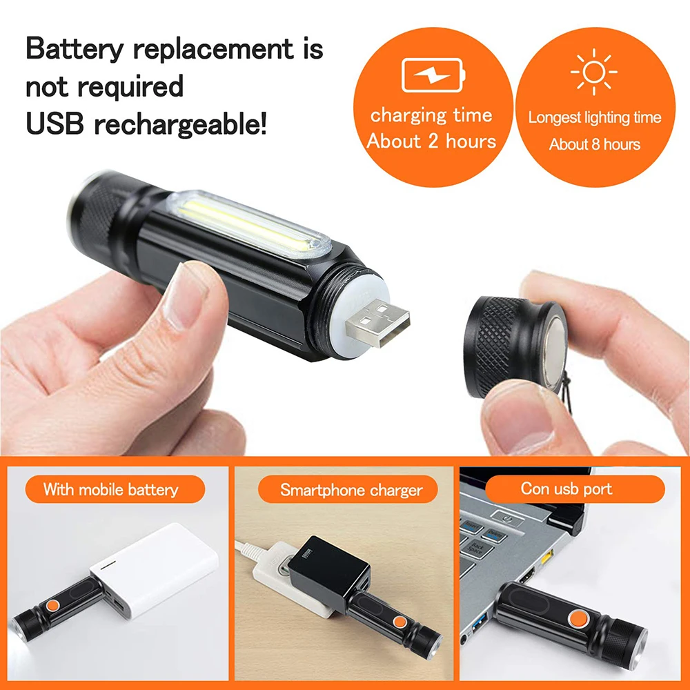 A:T6/L2-LED B: водонепроницаемый резиновый переключатель C: usb-разъем для зарядки D: задний магнит дизайн E: боковой светильник COB дизайн F: масштабируемый