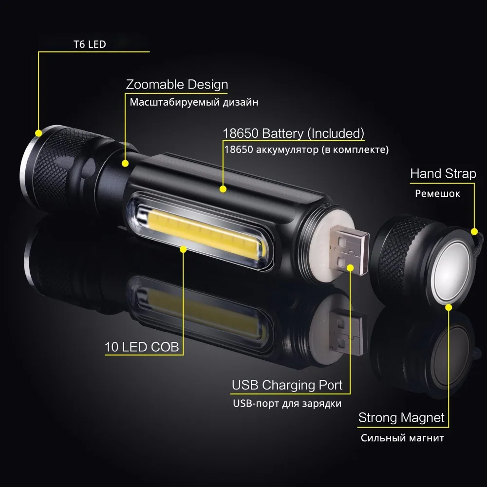 4 режима, включая COB high, COB low,T6 High,T6 strobe, просто нажмите кнопку переключения для переключения на любые режимы, удовлетворения различных потребностей и окружающей среды.