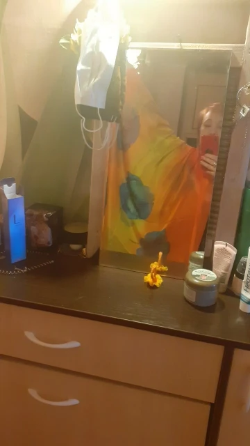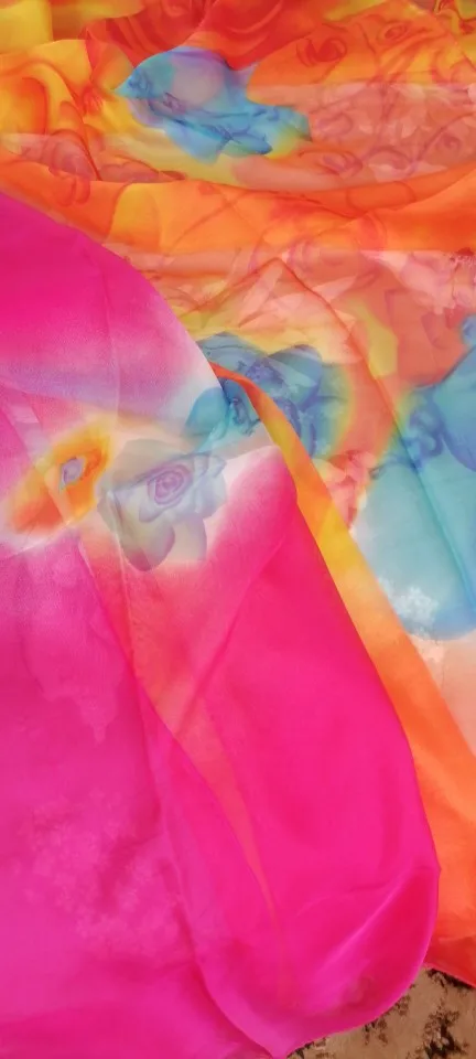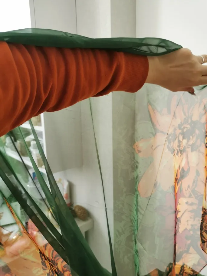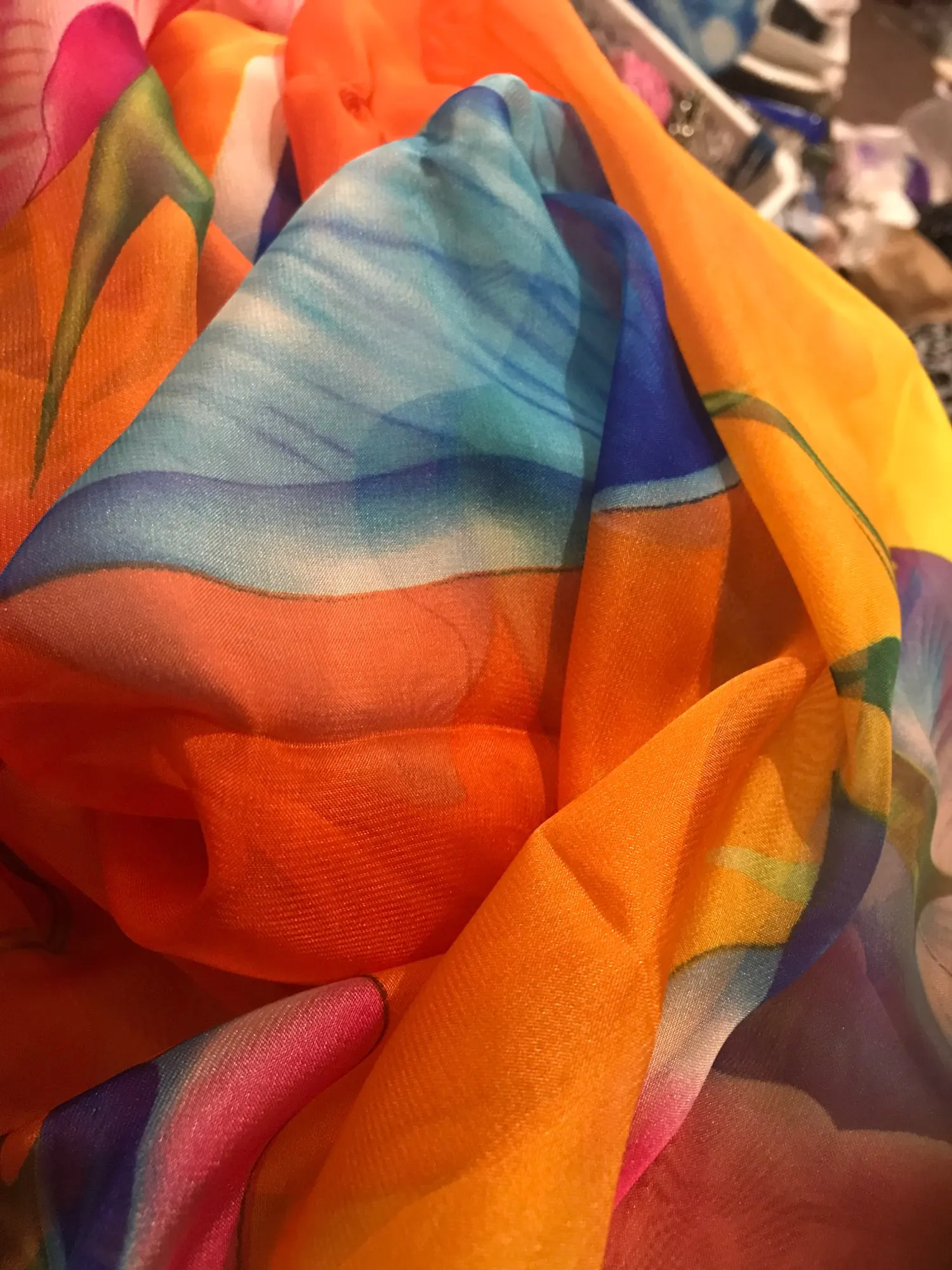 Красивый громадных размеров шарф. Покупала для пляжа, но такой громадиной можно замотать себя с ног до головы. Однако просвечивает. Я сложила его пополам и края обметала на швейной машинке цветными нитками. Теперь получилось достойное парео выйти на пляж. Вдвое сложенная ткань не так сильно просвечивает и свободно завязывается как угодно. Рекомендую!