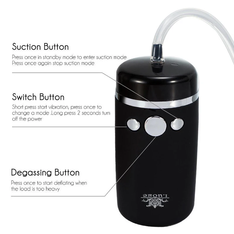Способ применения: Кнопка всасывания (правая): Нажмите один раз в режиме ожидания, чтобы войти в режим всасывания; Нажмите еще раз остановить режим всасывания; Кнопка включения (слева): короткое нажатие Пуск вибрации, нажатие одного раза для смены режима; Длительное нажатие 2 секунды выключение питания; Кнопка дегазации (средняя): Нажмите один раз, чтобы начать сдувание, когда нагрузка слишком тяжелая.