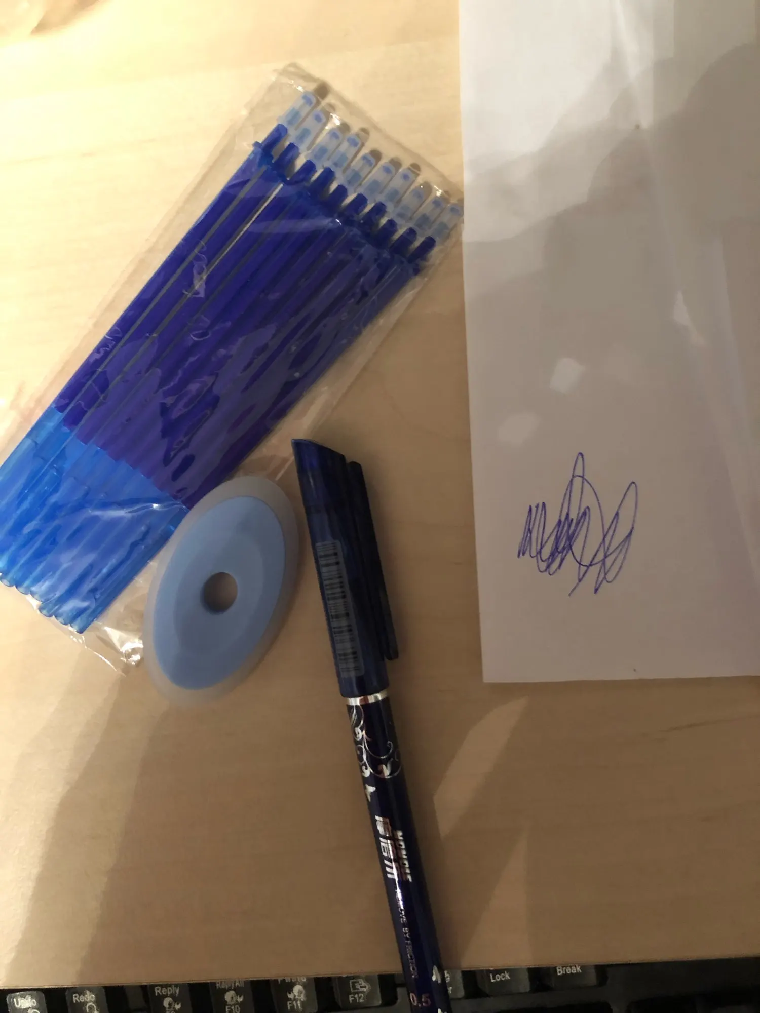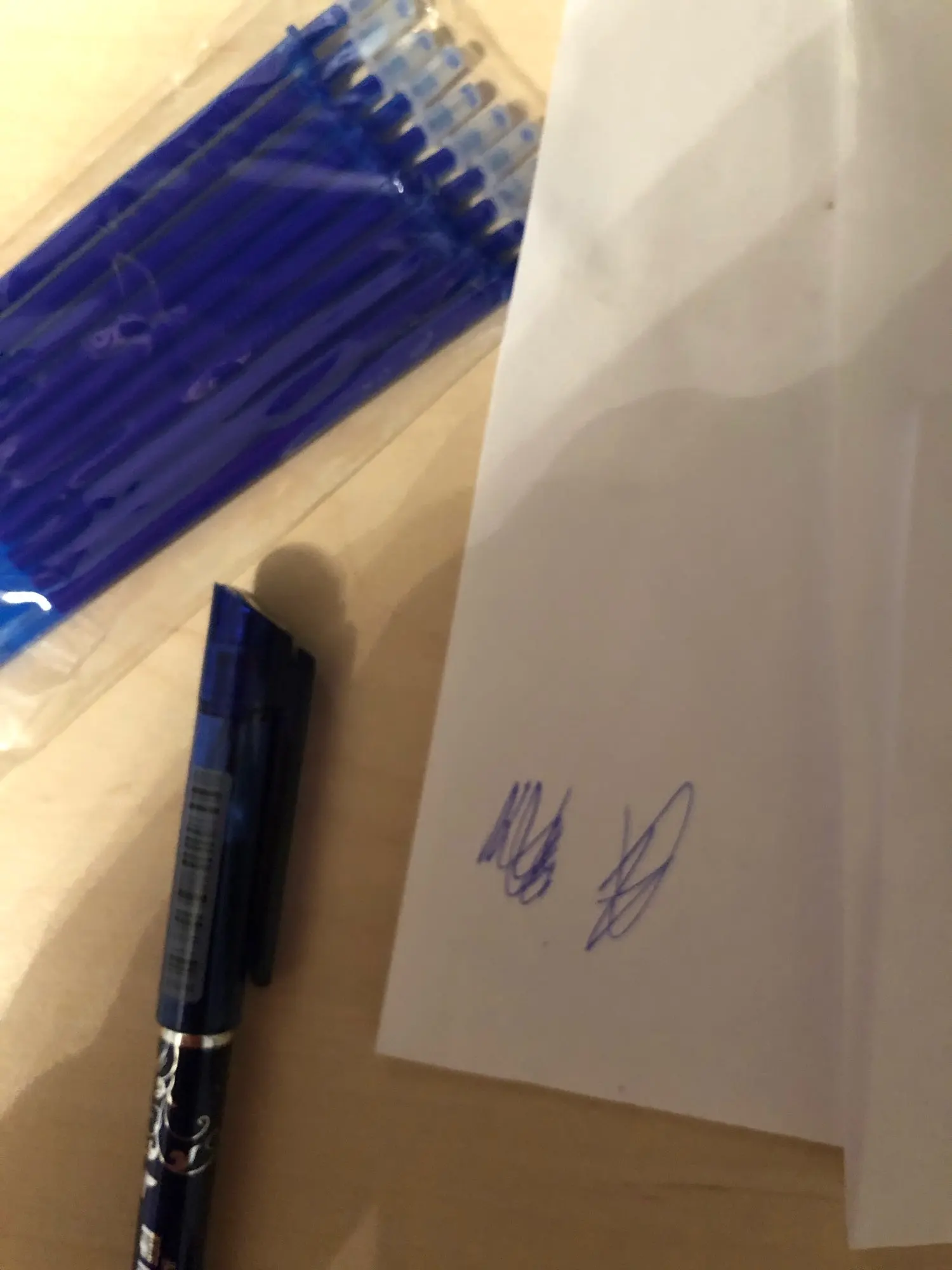 Ручки шли довольно долго. А так все хорошо: пишут, стирают. Когда стирают, остаётся небольшой след от написанного , но не критичный. Спасибо продавцу!