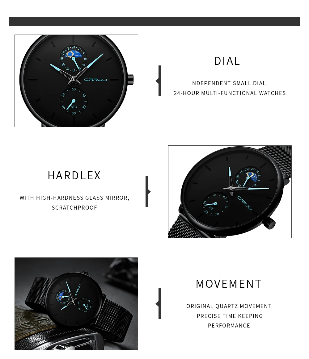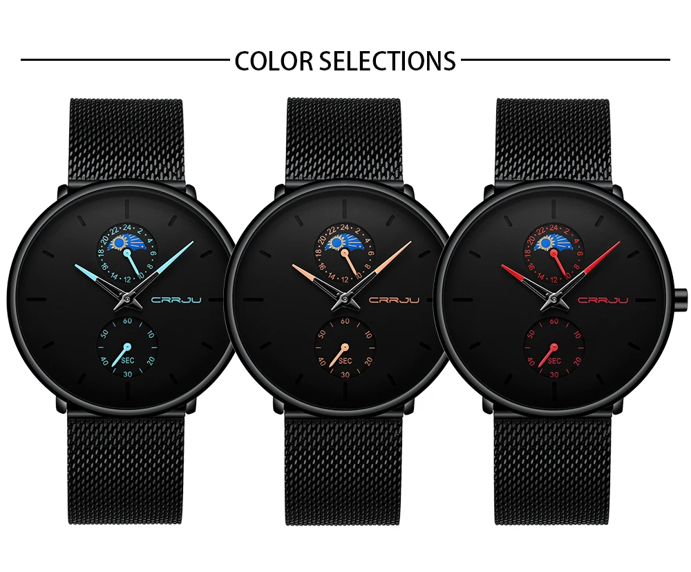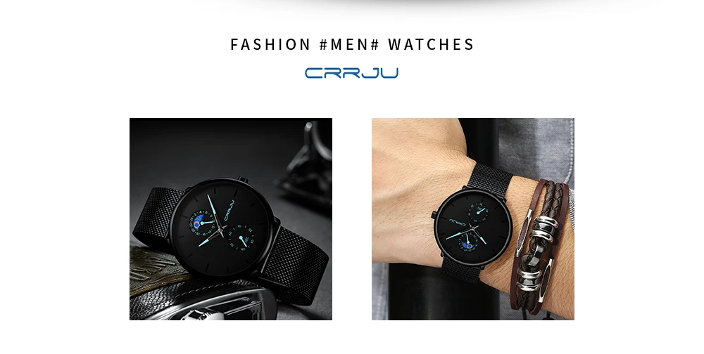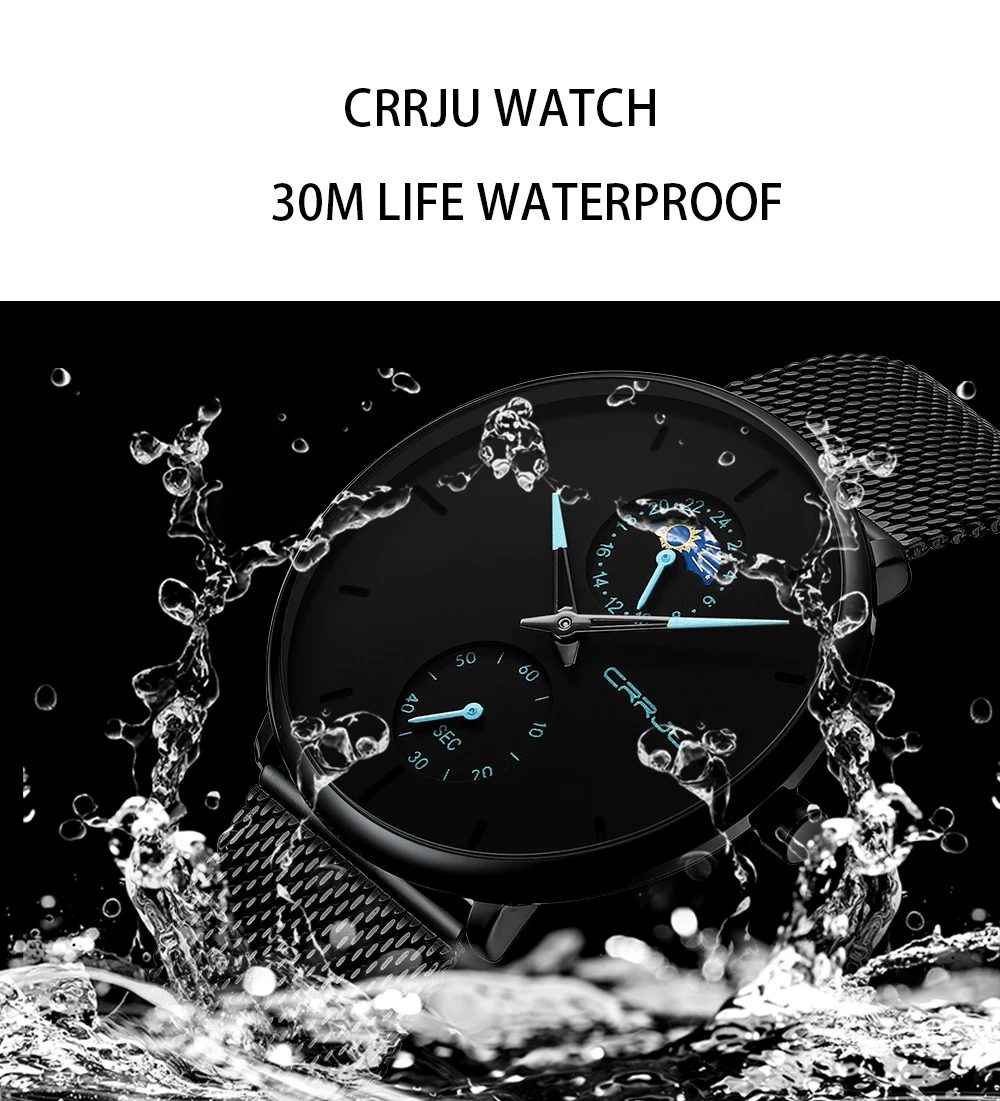 Часы CRRJU мужские наручные кварцевые, брендовые Роскошные деловые ультратонкие спортивные водонепроницаемые с сетчатым ремешком