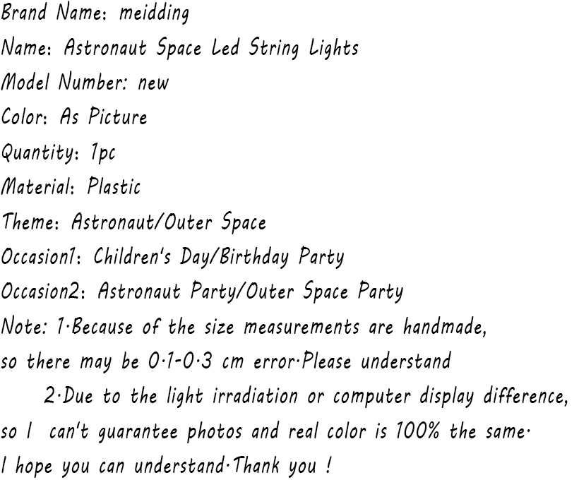 Бренд: meiddingНазвание: светодиодная гирлянда космонавтаНомер модели: новыйЦвет: как на фотоКоличество: 1 шт.Материал: пластикТема: космонавт/космическое пространствоПовод 1: день детей/вечерние рожденияСлучай 2: вечевечерние НКА космонавта/Вечеринка в космосе