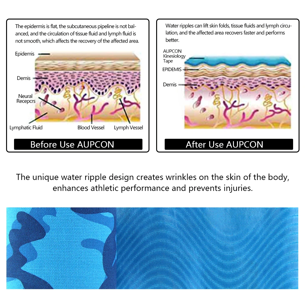 -Расслабление переутомленных уставших мышц и поддержка движения мышц-Не ограничивает движения, обеспечивая полный спектр движения-Клейкая подложка с волнообразным рисунком двигается вместе с кожей и мышцами-Используя 100% медицинский клей, не беспокойтесь о аллергии-Водонепроницаемый и дышащий