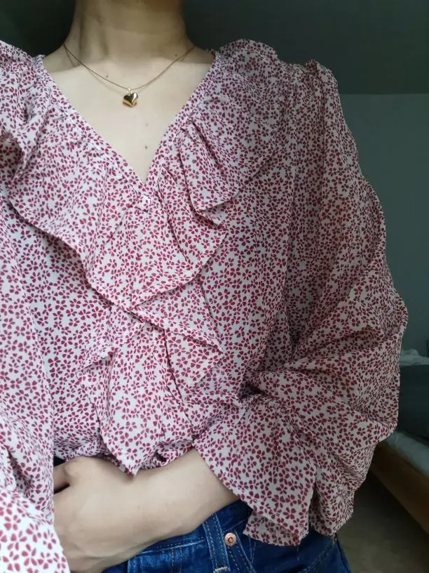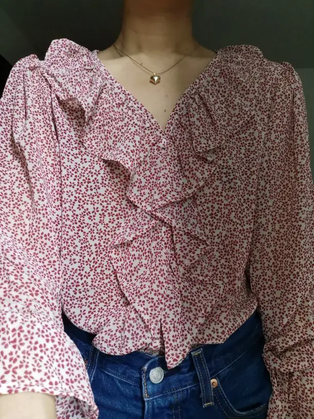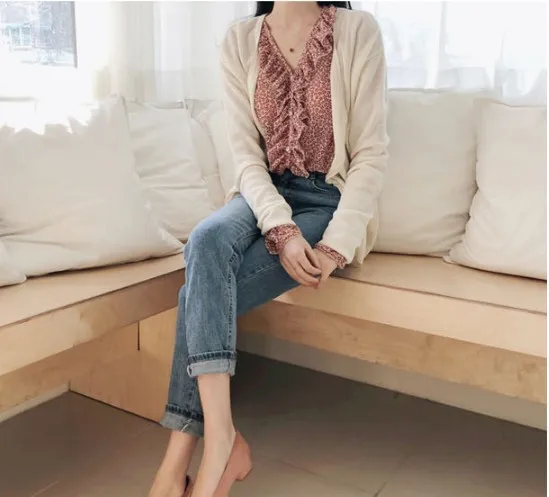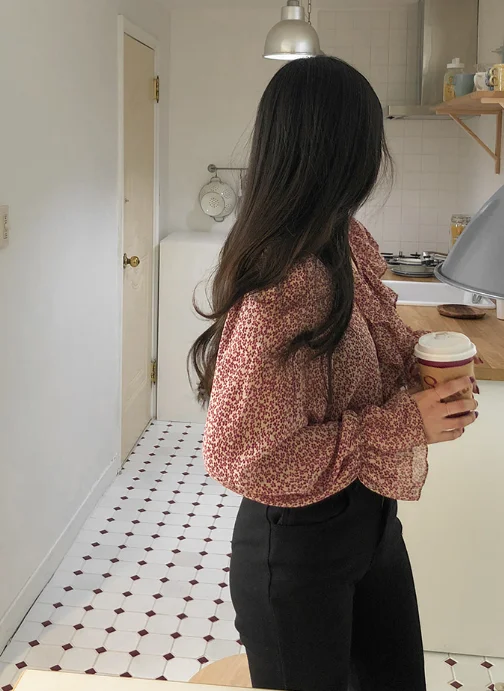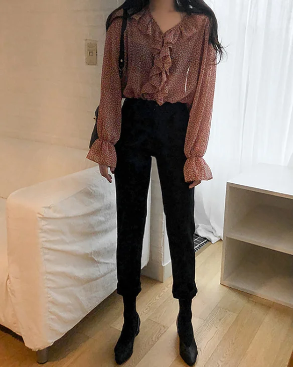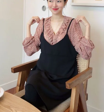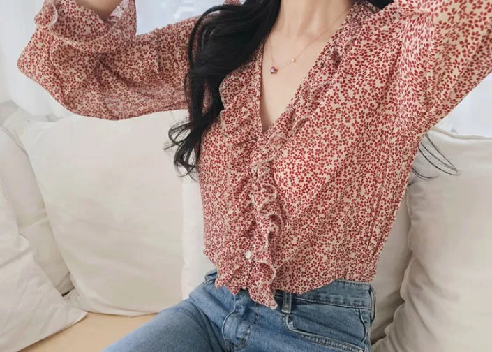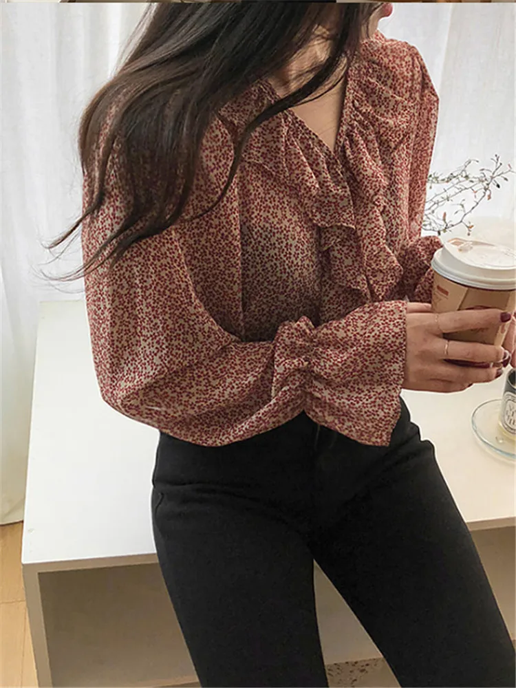 Новый красного цвета с длинными рукавами для девочек, летняя рубашка с цветочным рисунком V образным вырезом рубашки с рюшами Женские топы и блузки с принтом шифоновая блузка для женщин