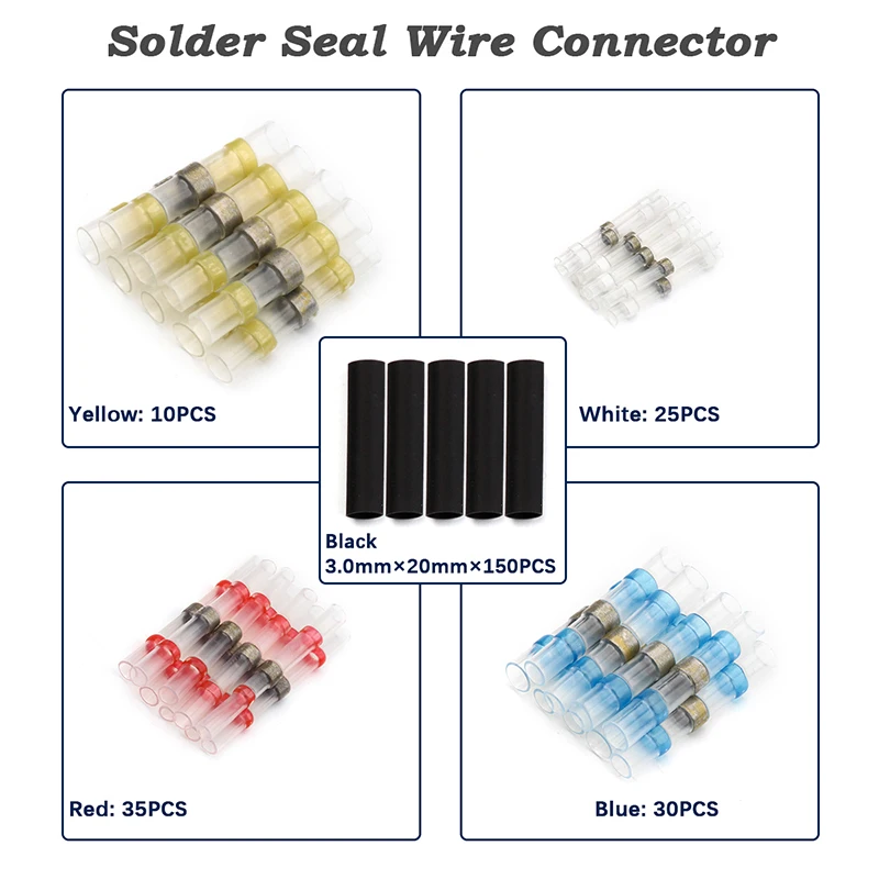 10 шт 12-10A.W.G 4,0-6.0мм ² (желтый)30 шт 16-14A.W.G 1,5-2,5 мм ² (синий)35 шт 22-18A.W.G 0,5-1.0мм ² (красный)25 шт 26-24A.W.G 0,25-0,34 мм ² (белый)150 шт термоусадочная трубка (черный)