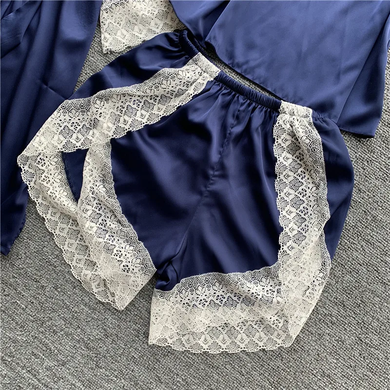 BZEL сексуальный кружевной Шелковая пижама комплекты сатиновая Пижама для Для женщин V-nevk одежда для сна топ на бретельках + шорты + халат Комплект для сна комплект из 3 предметов, стильные женские пижамы