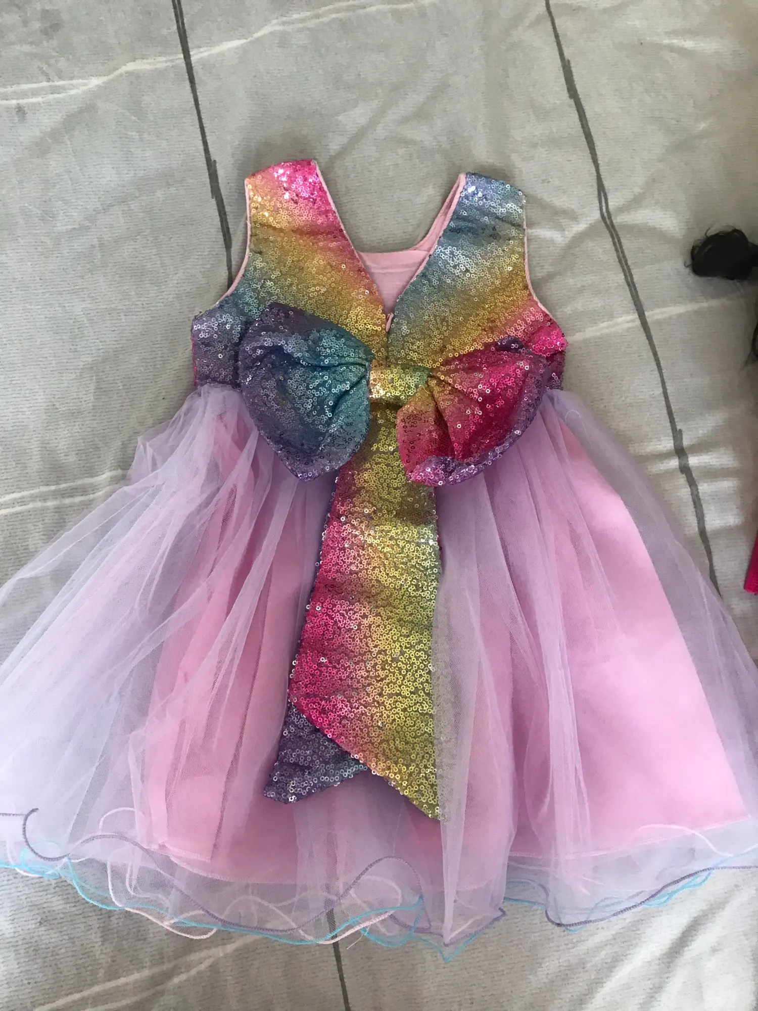 Платье великолепное, полностью соответствует фото. Немного торчат нитки и швы не ровные, но за такие деньги вовсе некритично. Брала на 1 год, размер подошёл. Посылка шла меньше месяца