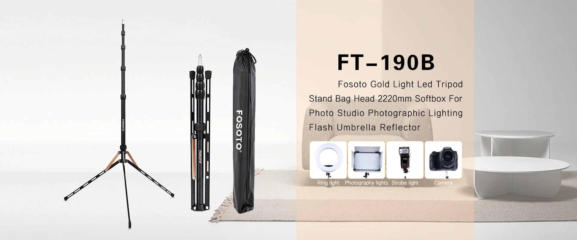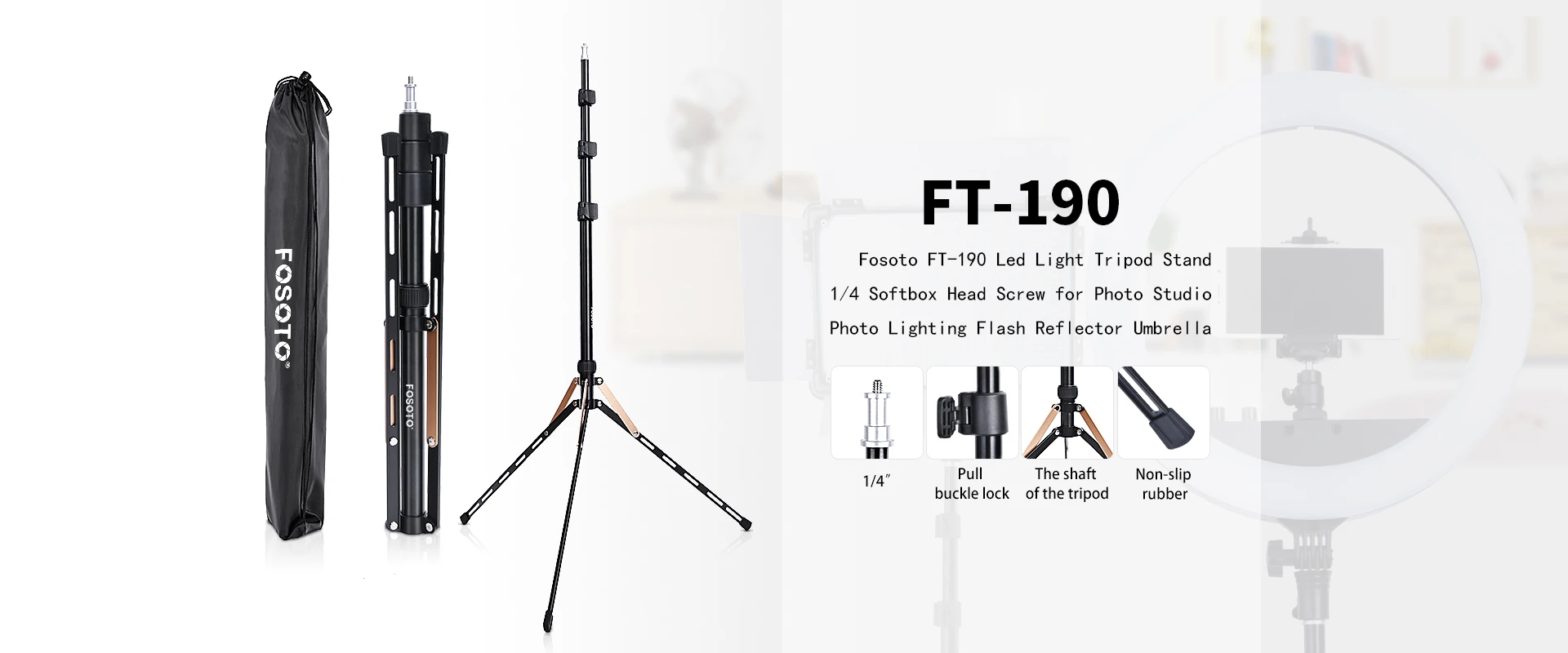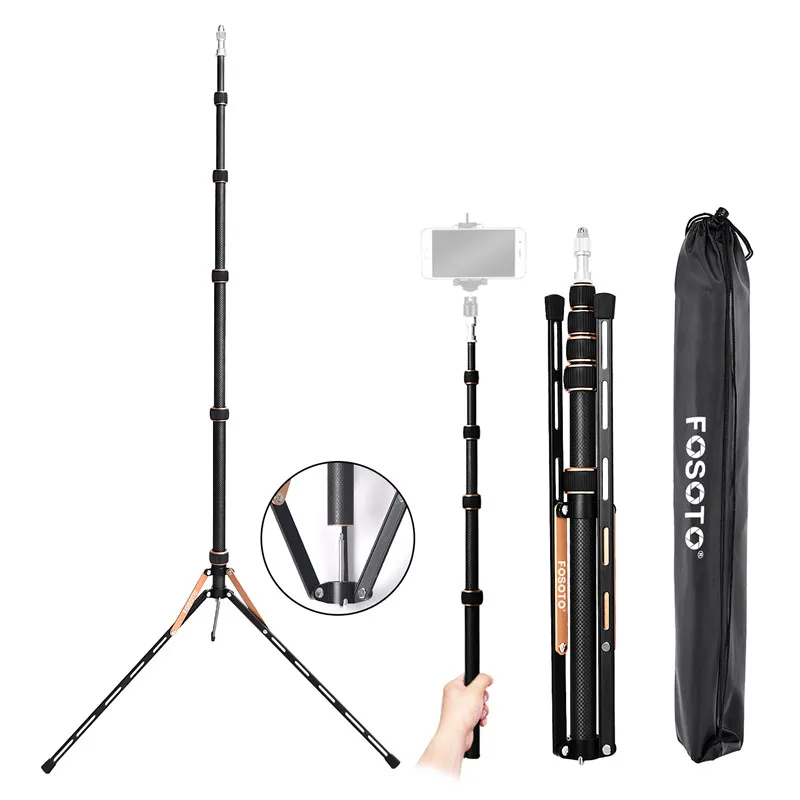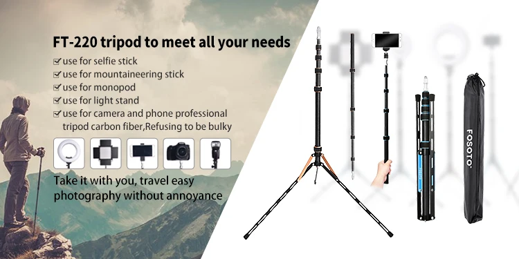Fosoto FT-220 штатив для камеры из углеродного волокна с винтовой головкой 1/4 & 3/8, светодиодная осветительная стойка для фотостудии, фотографического освещения, зонтаОписание продукта:Смелый и складнойЧетыре секции дизайнШтатив для осветительной стойки 2225 ммОсобенности 1: легкая модель подставкиВес нетто: 0,8 кгМатериал: углеродное волокноПодшипник: 5 кгВинт: винт 1/4 и 3/8Высота складывания: 48,5 смСкладывание: складывается вверх и внизДиаметр трубы: 13/16/19/22/25 ммМаксимальная рабочая высота: 2225 ммМинимальная рабочая высота: 485 ммБлизкая длина зонта: 410 ммДлина открытия зонта: 665 ммДиаметр зонта: 950 ммМожет использоваться для всех кольцевых лампОсобенности 2: селфи-палка и модель монопода1, материал из углеродного волокна. Компактный и удобный, вы можете взять его с собой в путешествие и наслаждаться расслабляющим путешествием.2, продукт может быть преобразован в селфи-палку, может быть свободно фотографировать, сохранить путешествие хороших моментов.3, также может быть монопод. По дороге на гору, вы можете служить палкой для альпинизма, чтобы помочь вам легко достичь вершины горы.4, нижняя часть рамы лампы может быть подвешена с тяжелыми нагрузками, может добавить больше нагрузки-подшипник, более стабильная Защита ваших продуктов5, он имеет 3/8 и 1/4 винтовой крышки, с функцией обычного штатива, может быть применен к кольцевым фонарикам, мобильным телефонам, флексозонтам, вспышке, цифровым камерам, DSLR, DV, мобильные телефоны и т. Д.6, штатив разработан с фиксатором ручки, чтобы защитить вашу лампу более стабильноУпаковка включает в себя:1 х Подставка из углеродного волокна1 х сумка для штативаКоробка-1 шт.1 x винт из алюминиевого сплава 1/4 и 3/81 х крышка винта из алюминиевого сплаваПримечание: кольцевой свет, держатель телефона и зонтик не включены