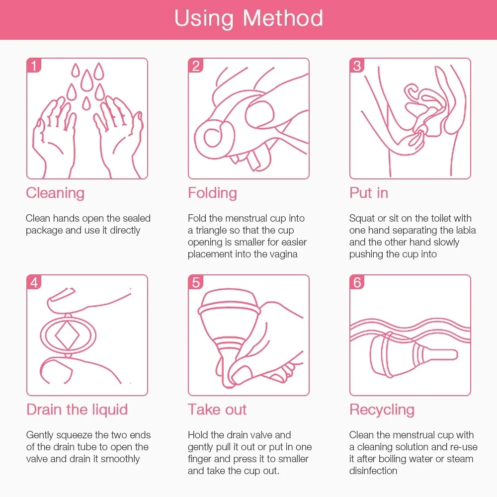Здоровье в период: Избегайте использования гигиенических салфеток флуоресцентным агентом для растворения крови в коже, поддержания чистоты в личных местах, чтобы не подвергать кожу воздействию бактерий.Хранение в чистом местеСпособен расслабить эмоциональные колебания менструального периода, физиологический период душевного регулирования и физиологическое настроение можно регулировать.Подходит для занятий спортом: Высокая интенсивность упражнений, таких какПлавание, езда на велосипеде, альпинизм, бег, ограждение и небольшие мячи и т. Д., Утечка не произойдет при использовании менструальной чашки AIWO в течение периода.Советы (следующие советы предоставляются пользователями)В первый раз появляется ощущение отека. Как правило, он исчезнет через два дня, больше не будет ощущаться отек, даже менструальное ощущение будет игнорироваться. Особое напоминание. Сохранение разряда во избежание чрезмерного переливания.При первом ti me, положение менструального cu p во влагалище легко левое или правое, неправильное положение возможно вызвать боковую утечку. Вагина каждой женщины отличается, ее нужно отрегулировать в соответствии с вашими чувствами, чтобы найти наиболее удобное место.Согласно отзывы от большинства женщину, которая используется в менструальная чаша, приседания самое лучшее положение, чтобы вставить, расслабить тело, выхлопной вовремя после вставки для удаления инородного тела Sensation.Технические характеристикиТип изделия: 30 мл водосточная менструальная чашкаМатериал: медицинский жидкий силиконТвердость: 40HA, очень мягкийРазмерыРазмер S: 36*36*78 мм/1,4*1,4*3,07 дюймов.Подходит для детей без рождения или для детей до 35 лет.Размер M: 40*40*80 мм/1,57*1,57*3,15 дюймов.Подходит для детей 2-35 лет и старше.Примечание: Не используйте!Использование метода:1. Чистка: Очистите руки, откройте запечатанную посылка и используйте ее напрямую2. Складывание: Сложите менструальную чашку в треугольник, чтобы отверстие чашки было меньше для более удобного размещения во влагалище3. Положить в: приседать или сидеть на унитазе одной рукой, разделяя губы, а другой медленно толкая чашку в4. Слив жидкости: аккуратно выдавите два конца сливной трубки, чтобы открыть клапан и слить его плавно.5. Вынуть: удерживайте сливной клапан и аккуратно вытяните его; Или положите в один палец и нажмите его, чтобы уменьшить и вынуть чашку.6. Переработка: Очистите менструальную чашку раствором для очистки и повторно используйте ее после кипячения или паровой дезинфекции N