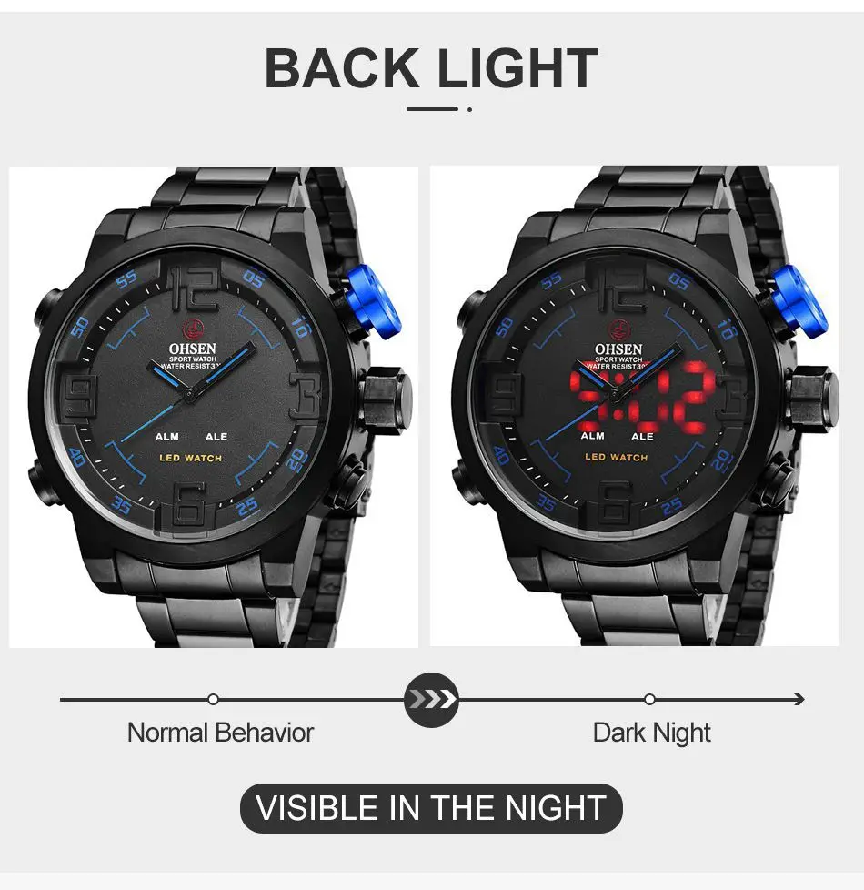 Цифровой + аналоговый двойной дисплей времениСистема отображения 12 часов или 24 часаВремя, секунды, месяц, дата, неделя, функция будильникаПри любом режиме нажмите любую клавишу один раз, чтобы проверить время и осветить светодиодный индикатор в течение трех секундВодонепроницаемость 3 АТМ (не подходит для плавания)Прочный чехол для часов из нержавеющей стали и ремешок для часов