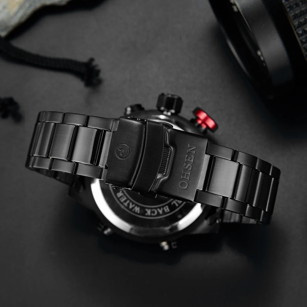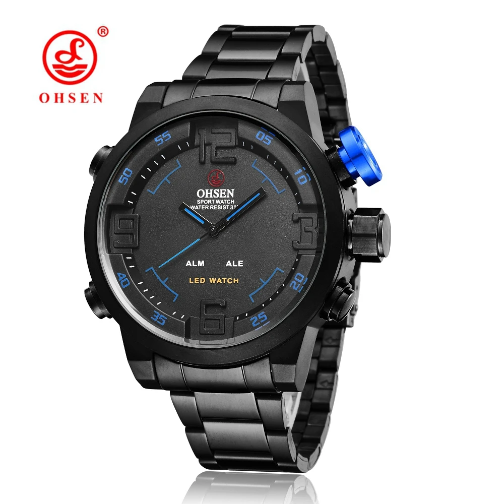 Часы наручные OHSEN AD1608 Мужские кварцевые, аналоговые цифровые водонепроницаемые из нержавеющей стали, в стиле милитари, черныйсеребристый цвет