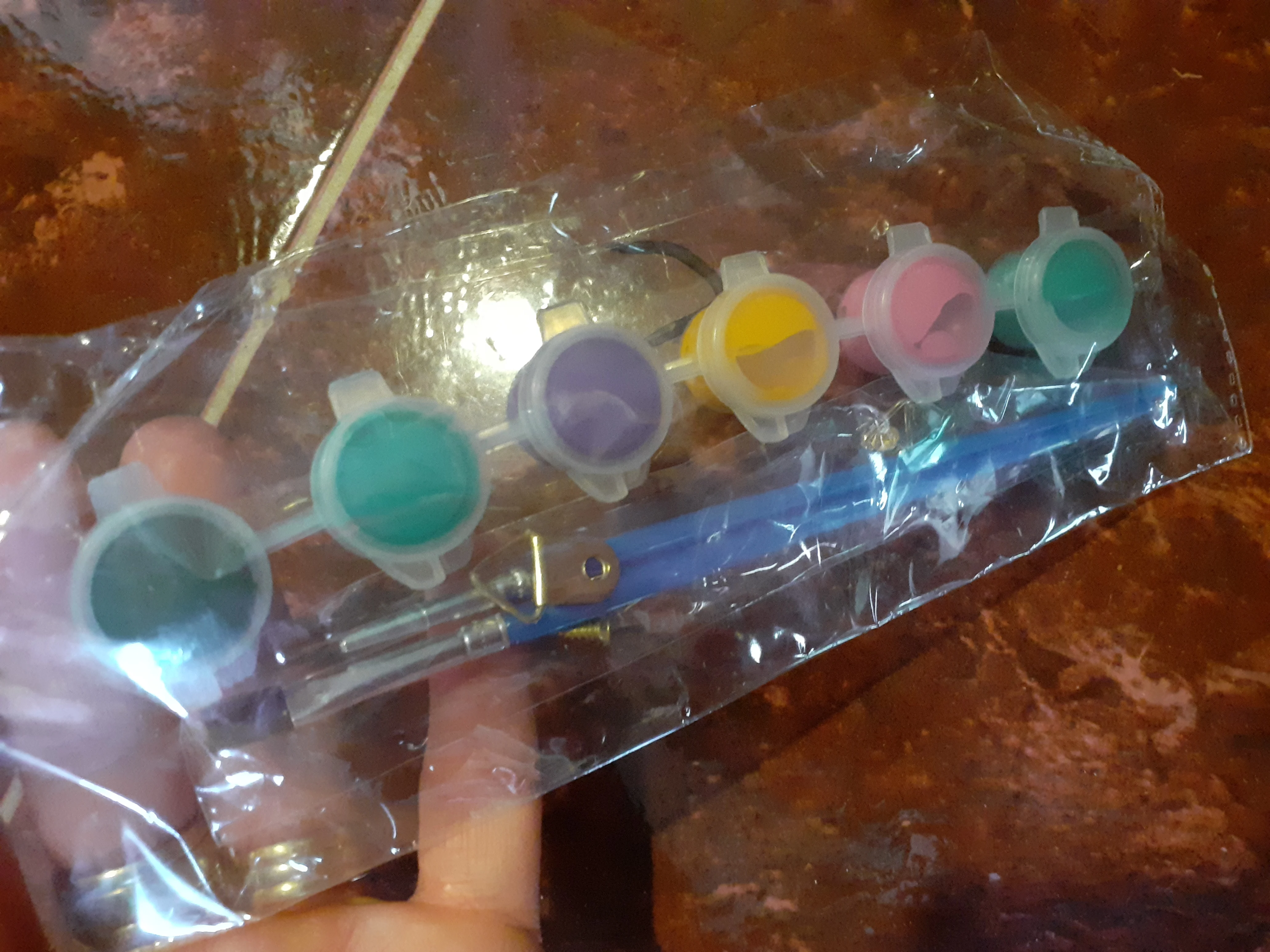 Пришли краски без кисточек. Шли с отслежкой. Но кисточки скорее всего стырили на почте, тк пакет был вскрыт и заклеен скотчем. Ну и баночки очень маленькие,,, жалко что без кисточек пришли
