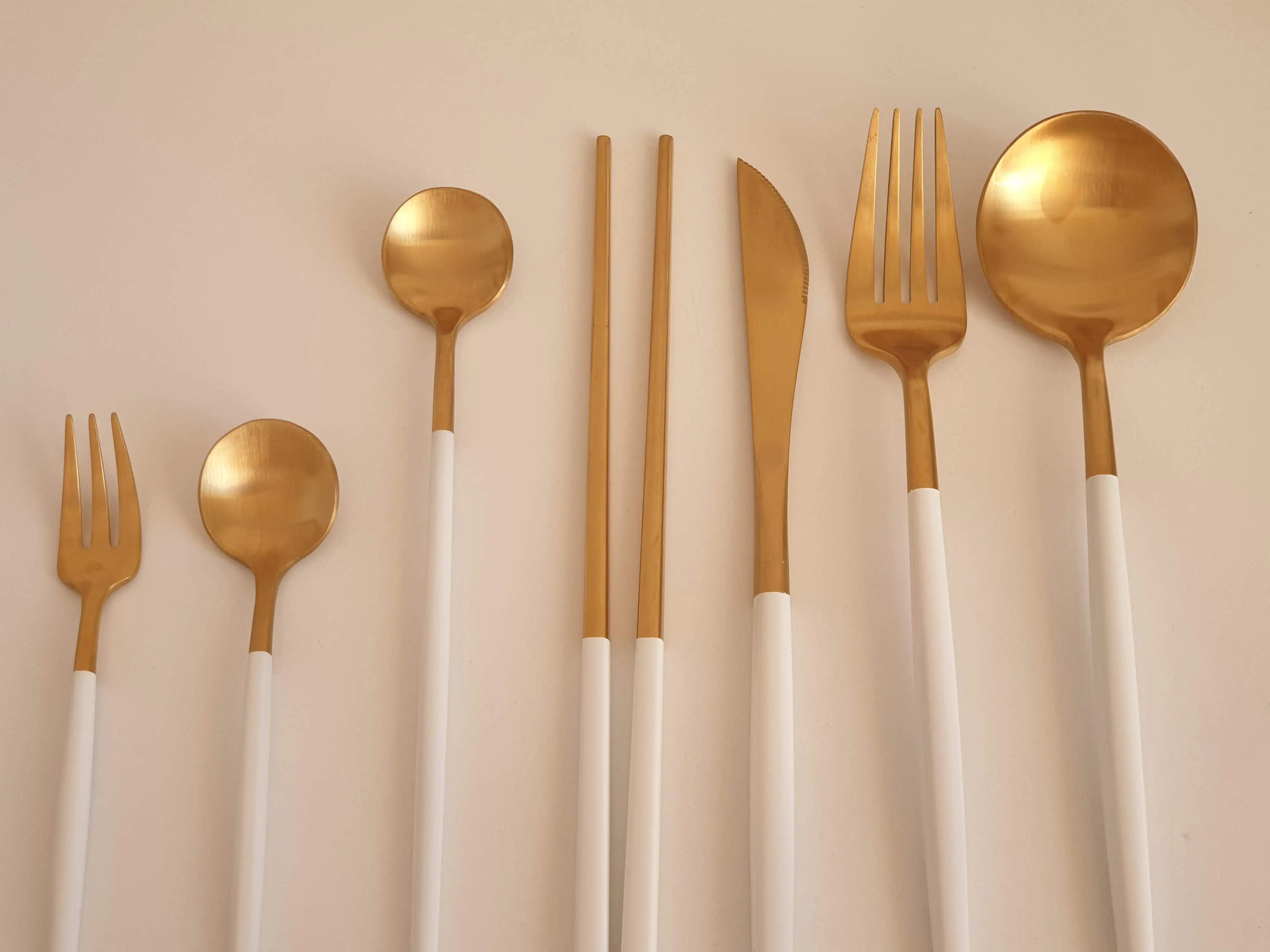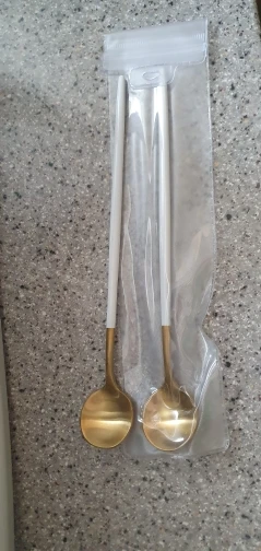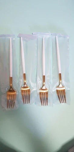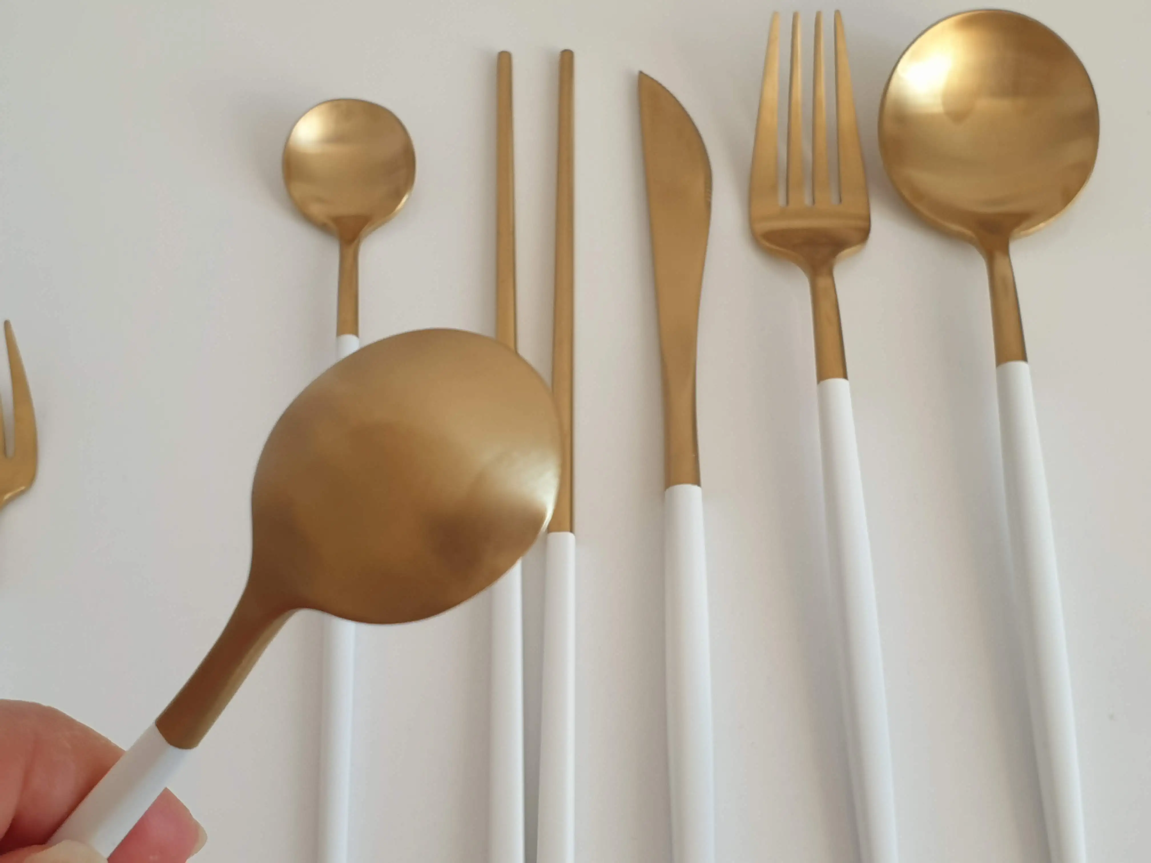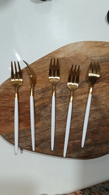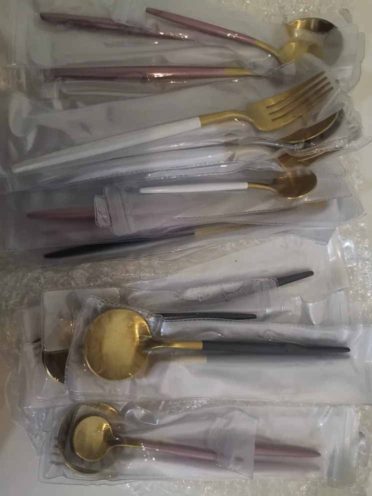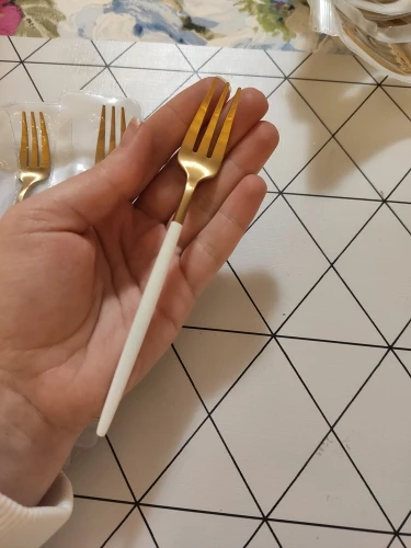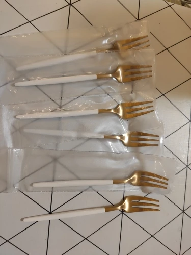 Заказывал столовые приборы "золото с белым". Пришло в течение недели. Курьер доставил домой. Товар соответствует картинке. Но есть небольшие замечания. Зубцы на вилке немного криво расположены, но можно исправить это. Края ложки островатые. Приборы тяжелые. Размер столовой ложки рассчитан на большой рот. Использовать каждый день не буду, но для сервировки для особого случая подойдут.