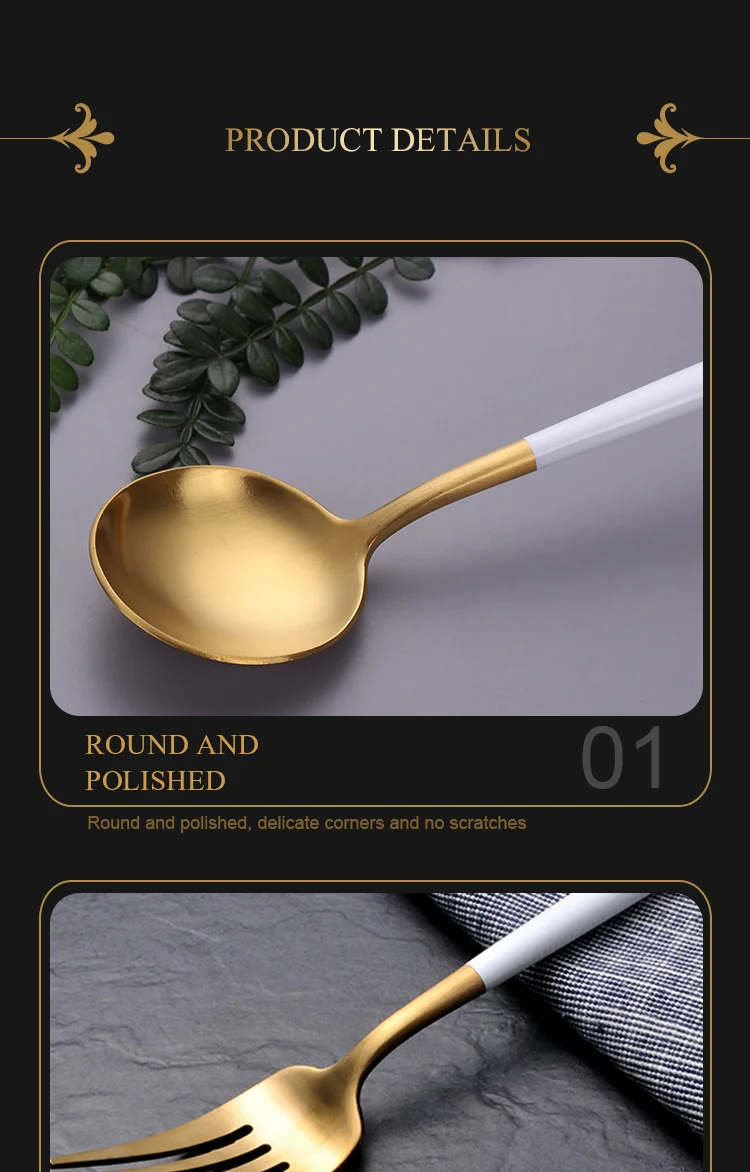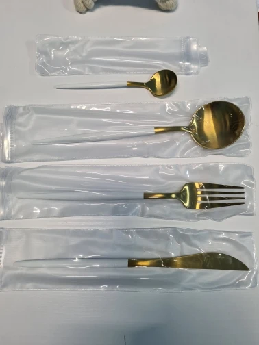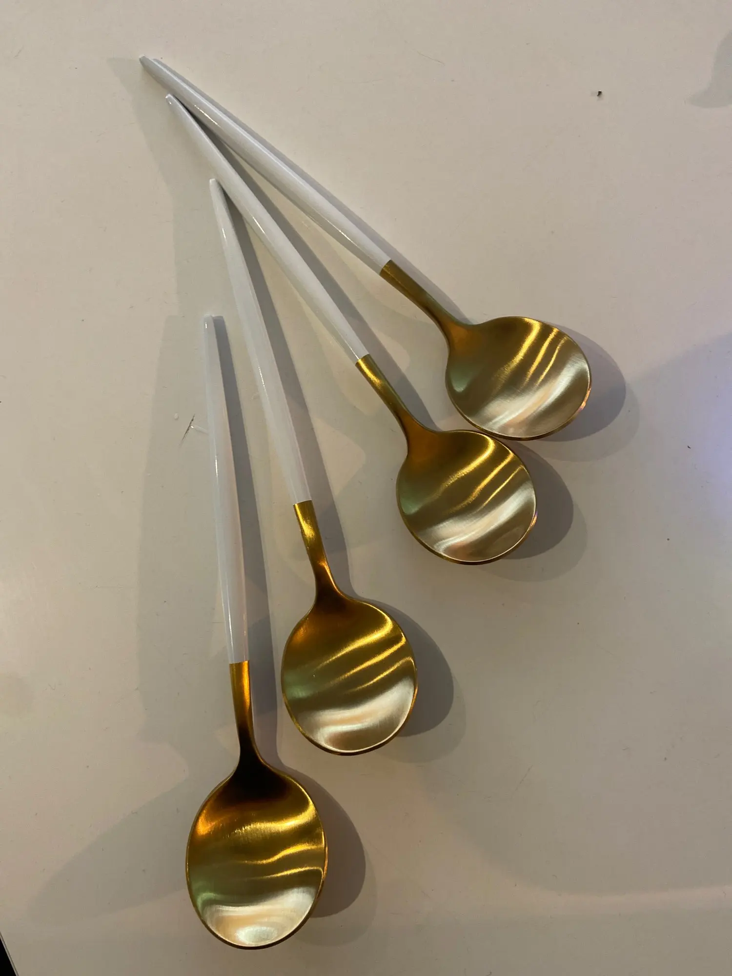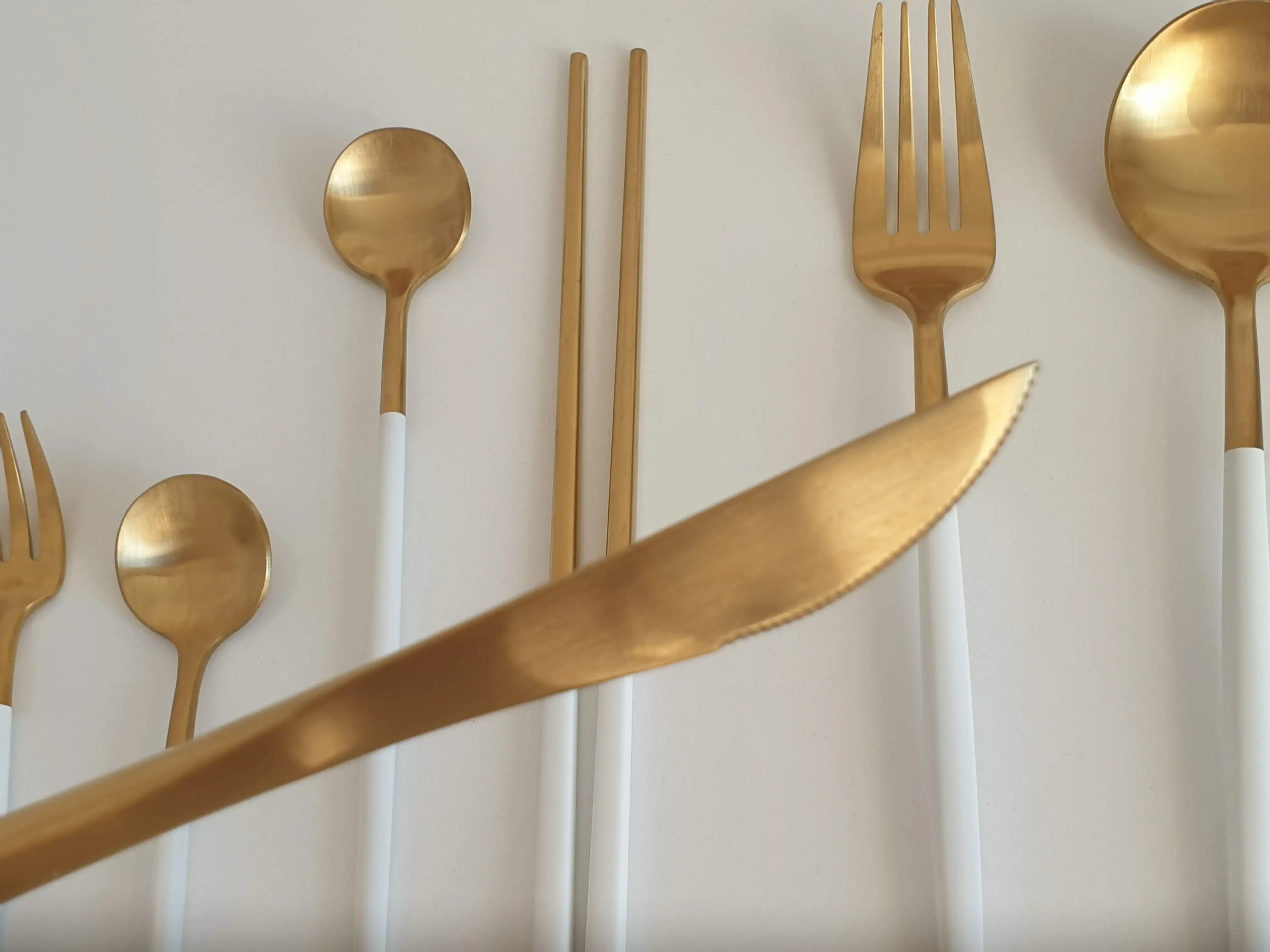 Заказывал столовые приборы "золото с белым". Пришло в течение недели. Курьер доставил домой. Товар соответствует картинке. Но есть небольшие замечания. Зубцы на вилке немного криво расположены, но можно исправить это. Края ложки островатые. Приборы тяжелые. Размер столовой ложки рассчитан на большой рот. Использовать каждый день не буду, но для сервировки для особого случая подойдут.