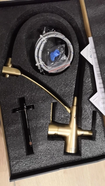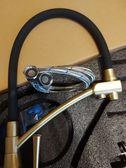 Только что установили. Все работает. Красивый , царапин нет, шланг - очень удобно. В комплекте очень удобный ключ для установки. Цвет матовое жёлтое золото. Доставка на дом курьером СДЭК.